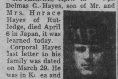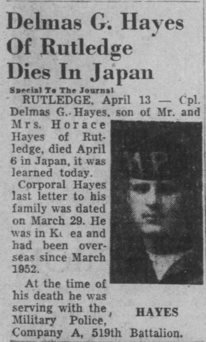 Cpl. Delmas G. Hayes, son of Mr. and Mrs. Horace Hayes of Rutledge, died April 6 in Japan, it was learned today. Corporal Hayes last letter to his family was dated on March 29. He was in Korea and had been overseas since March, 1952. At the time of his death he was serving with the Military Police, Company A, 519th Battalion.