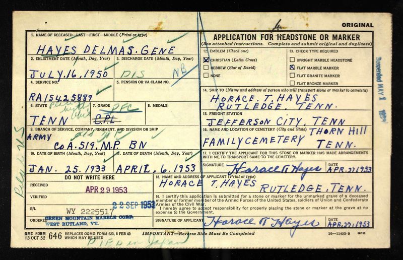 Private First Class Delmas Hayes died in action in Korea, April 6, 1953.