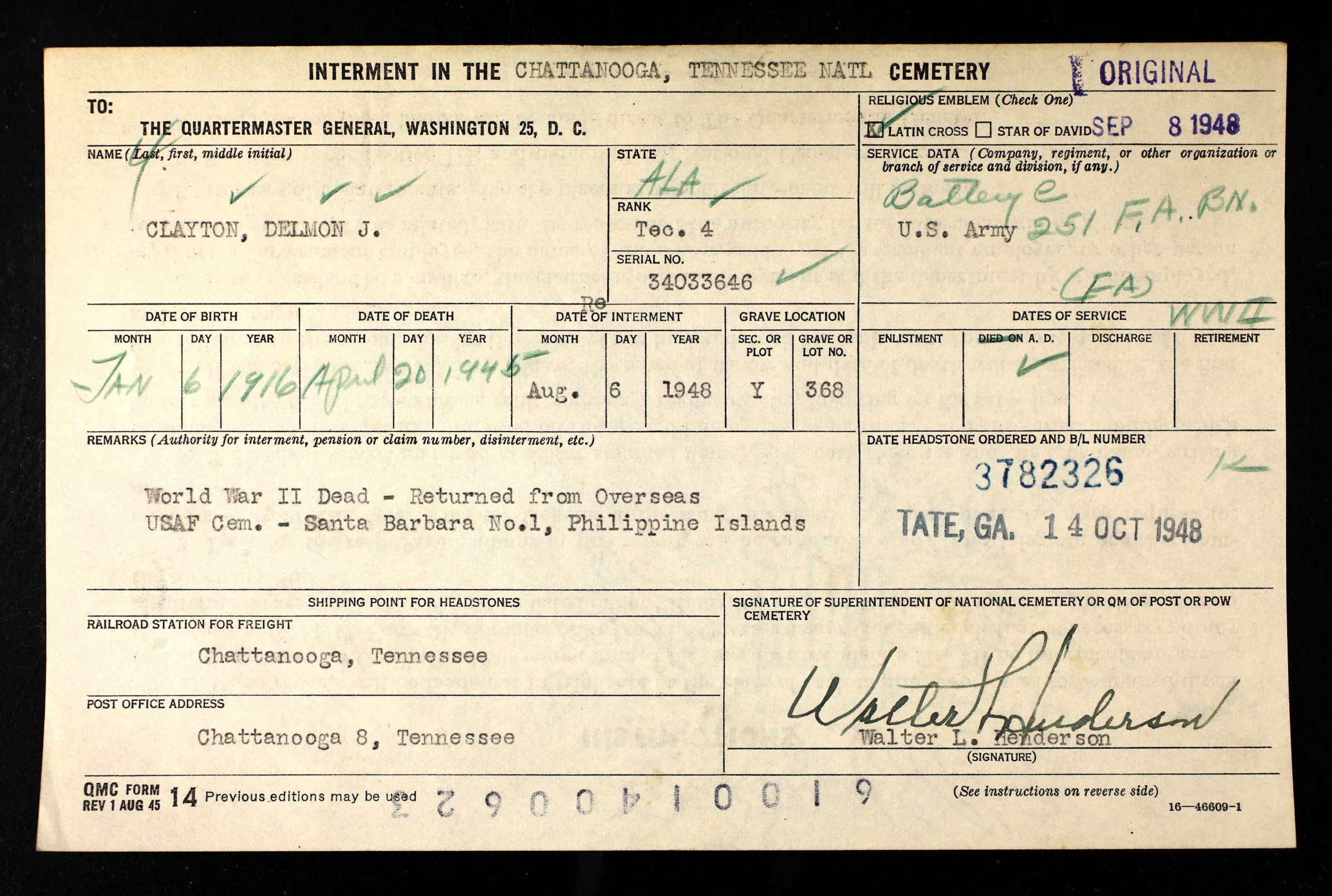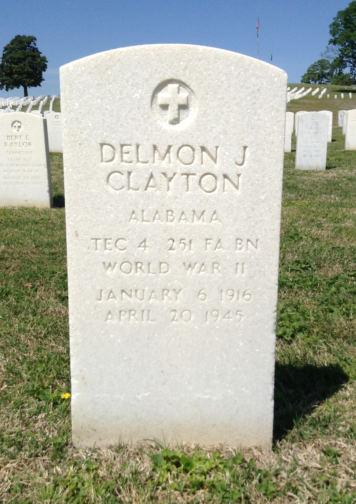 Sgt. Delmon Clayton, age 29, was killed in action while serving with the Field Artillery on Luzon, in the Philippines on April 20, 1945. He entered the service March 24, 1942, and had spent 13 months overseas. He was the son of Mrs. Bertha Clayton and the late Joe Clayton, of Section Rt. 2, and also lease many other relatives.