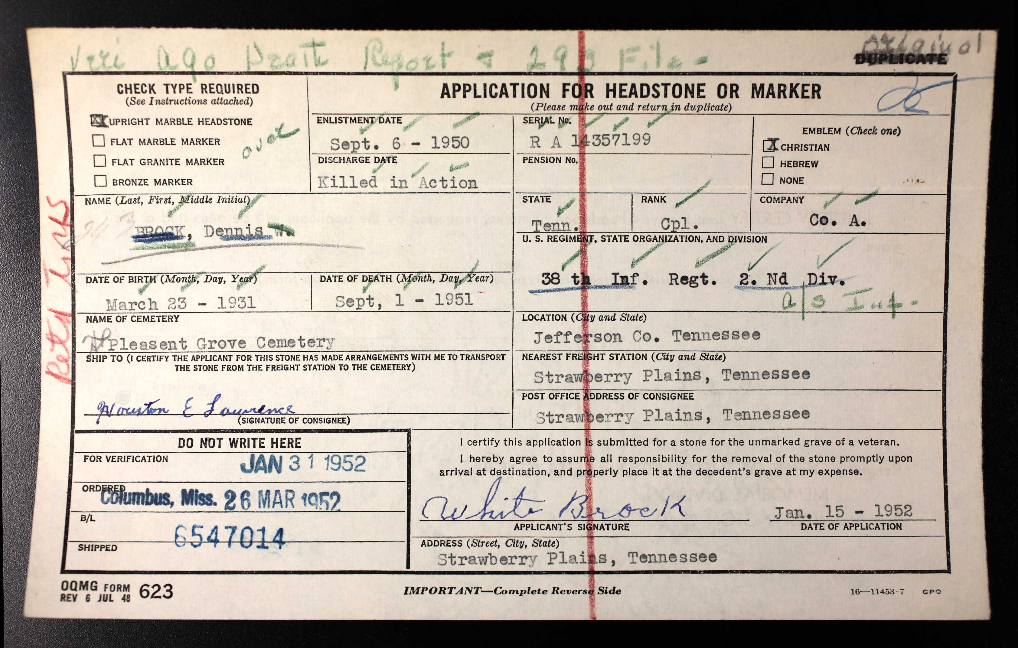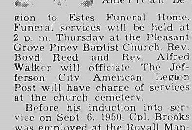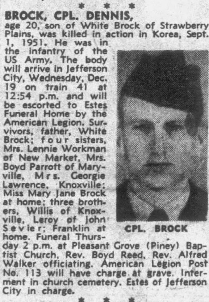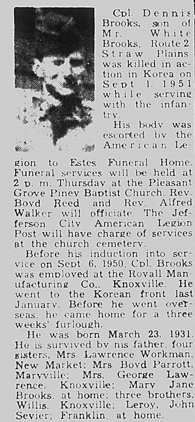Cpl Dennis Brooks, son of Mr. White Brooks, Route 2 Straw Plains was killed in action in Korea on Sept. 1, 1951 while serving with the infantry. His body was escorted by the American Legion of Estes Funeral Home. Funeral Services will be held at the Pleasant Grove Piney Baptist Church.