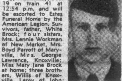 He was born March 23, 1931. He is survived by his father, four sisters, Mrs. Lawrence Workman, New Market: Mrs. Boyd Parrott, Maryville: Mrs. George Lawrence, Knoxville: Mary Jane Brooks at home: three brothers, Willis, Knoxville, Leroy John, Sevier and Franklin at home.