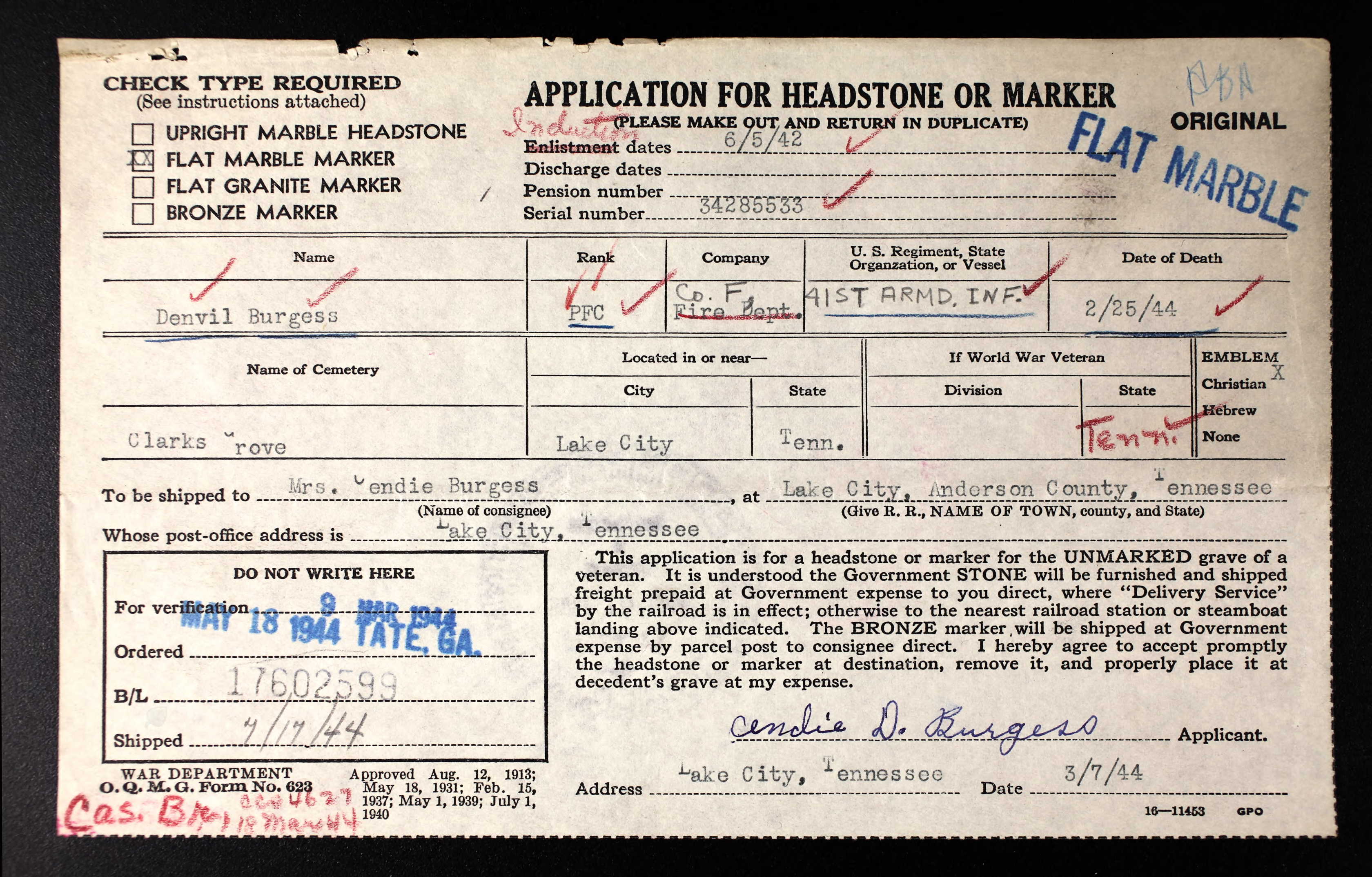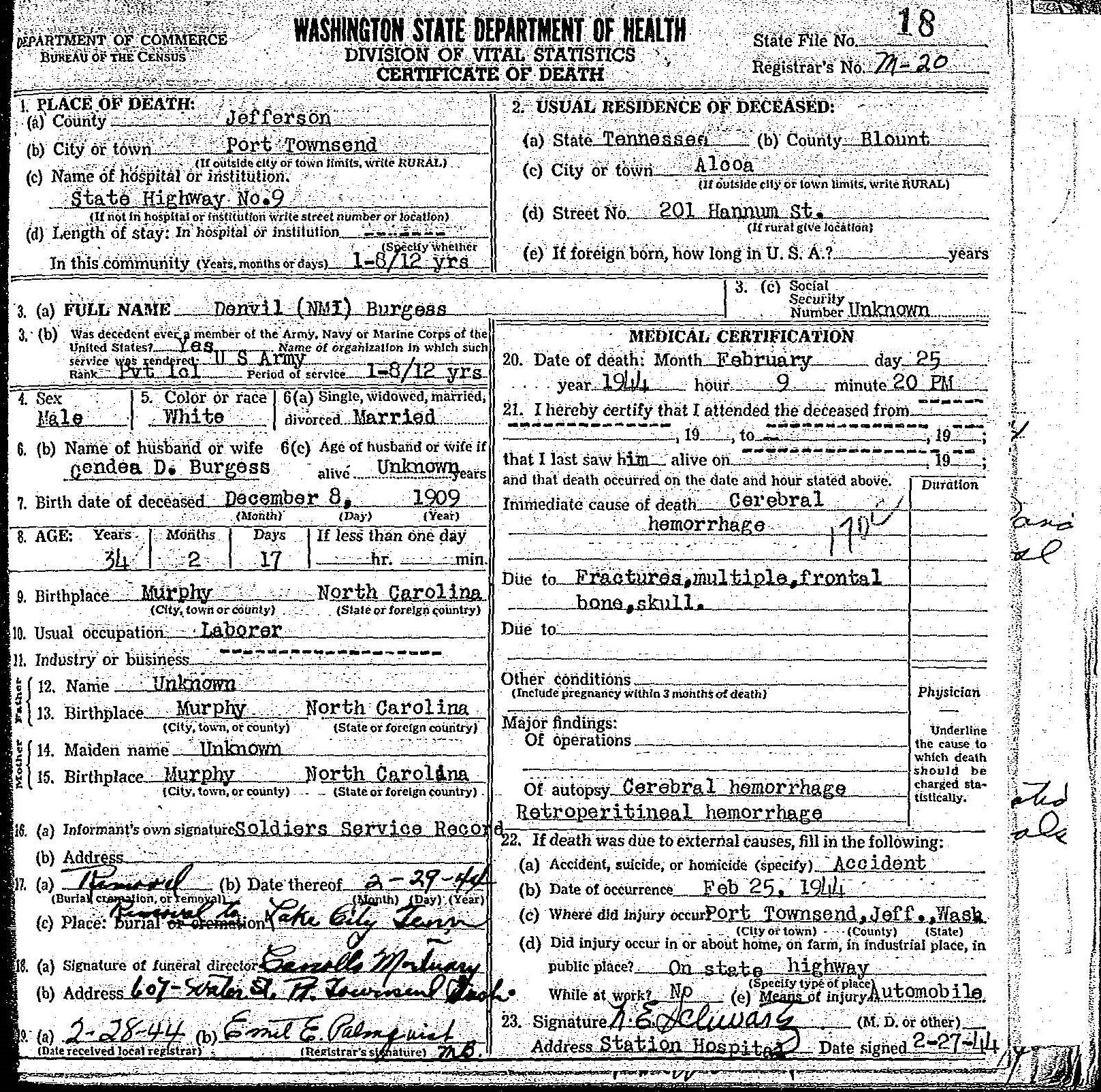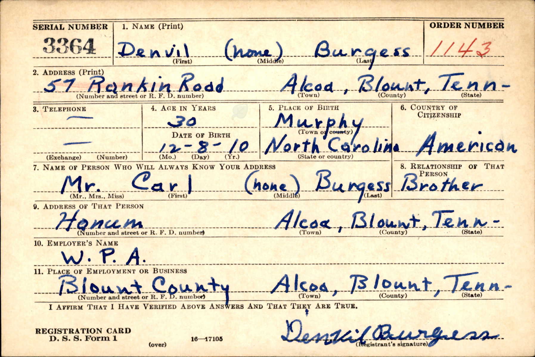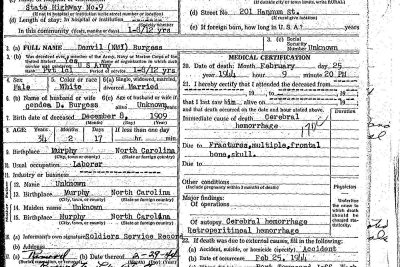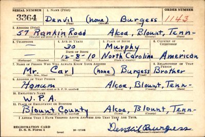 Denvil Burgess was born on 8 December 1909 at Murphy, Cherokee County, North Carolina, to Zebedee Vance Burgess and Mary Ann Brannon. He married Cendie Davis in Blount County, TN on 7 November 1941.