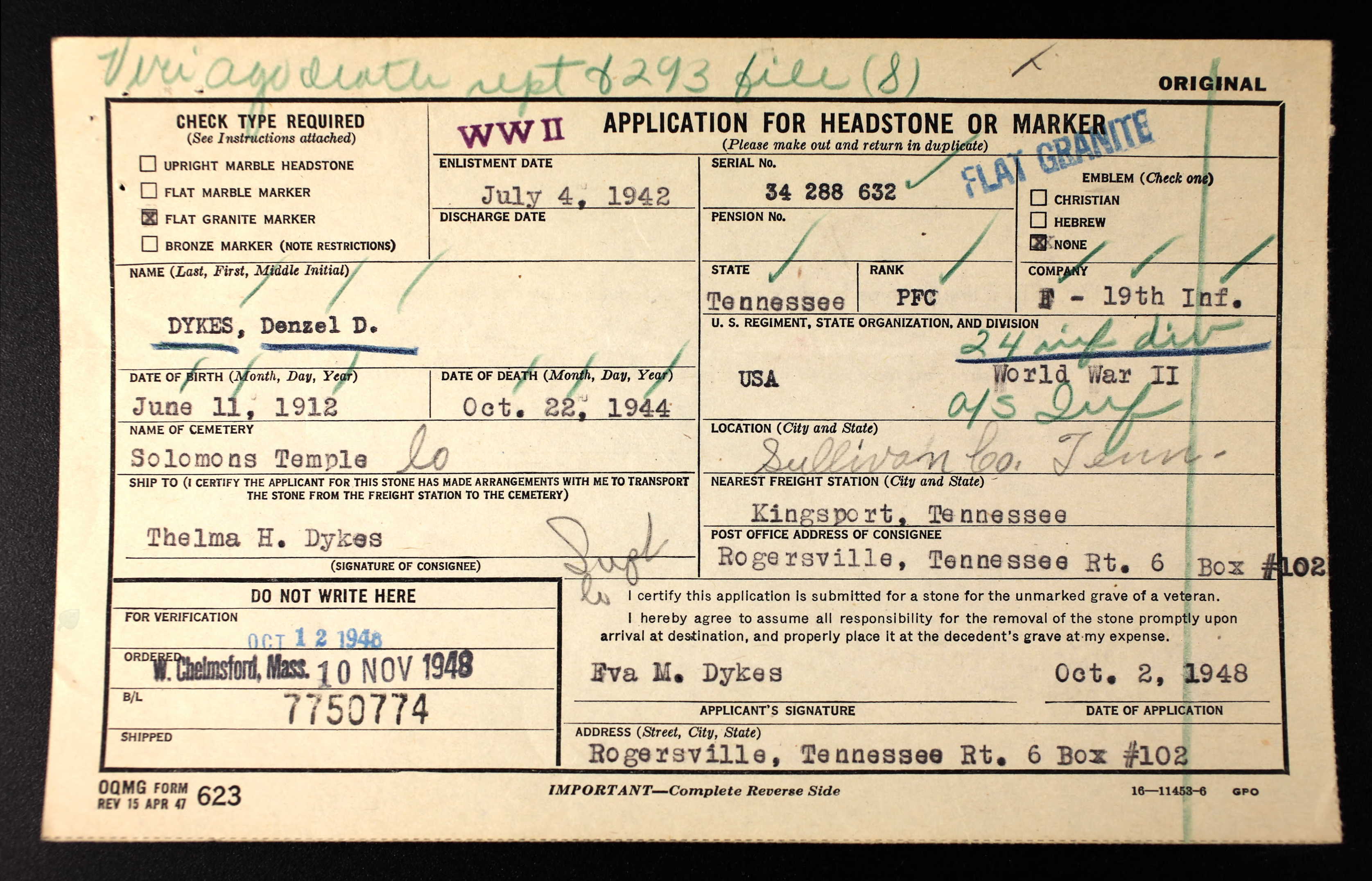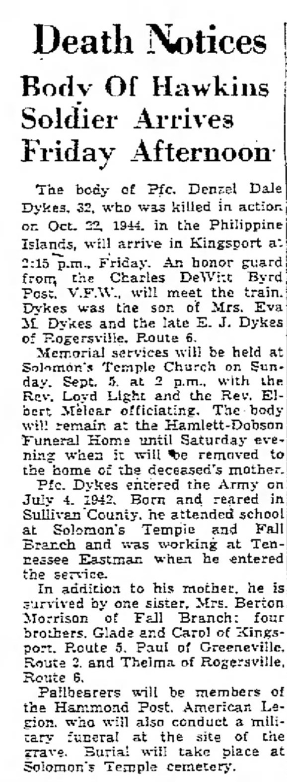The body of PFC Denzel Dale Dykes, 32, who was killed in action on October 22, 1944 in the Philippine Islands, will arrive in Kingsport at 2:15 p.m. A honor guard from the Charles DeWitt Byrd Post, V.F.W. will meet the train. Dykes was the son of Mrs. Eva M. Dykes and the late E.J. Dykes of Rogersville, Route 6. PFC Dykes entered the Army on July 4, 1942. Born and reared in Sullivan County, he attended school at Solomon’s Temple and Fall Branch and was working at Tennessee Eastman when he entered the service. In addition to his mother, he is survived by one sister, Mrs. Berton Morrison of Fall Branch: four brothers, Glade and Carol of Kingsport, Route 5, Paul of Greeneville, Route 3 and Thelma of Rogersville, Route 6. Burial will take place at Solomon’s Temple cemetery.