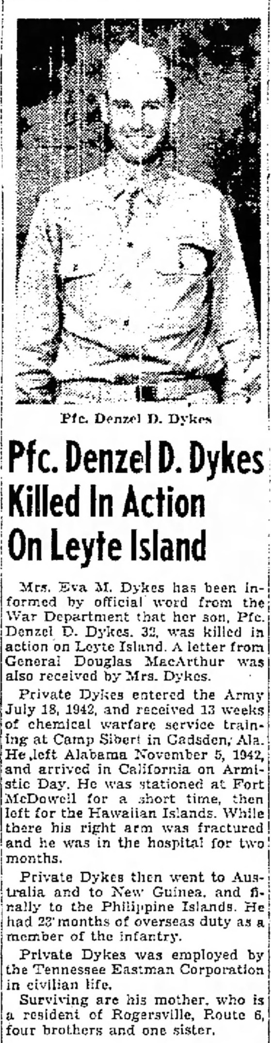 PFC Denzel D. Dykes killed in action on Leyte Island. Mrs. Eva M. Dykes has been informed by official word from the War Department that her son PFC Denzel D. dykes, 33, was killed in action on Leyte Island. A letter from General Douglas MacArthur was also received by Mrs. Dykes. Private Dykes entered the Army July 18, 1942 and received 13 weeks of chemical warfare service training at Camp Sibert in Cadsden, Ala. He left Alabama November 5, 1942, and arrived in Califormia on Armistic Day. He was stationed at Fort McDowell for a short time, then left for the Hawaiian Islands. While there his right arm was fractured and he was in the hospital for two months. Private Dykes then went to Australia and to New Guinea, and finally to the Philippine Islands. He had 23 months of overseas duty as a member of the infantry. Private Dykes was employed by the Tennessee Eastman Corporation in civilian life. Surviving are his mother, who is a resident of Rogersville, Route 6, four brothers and one sister.