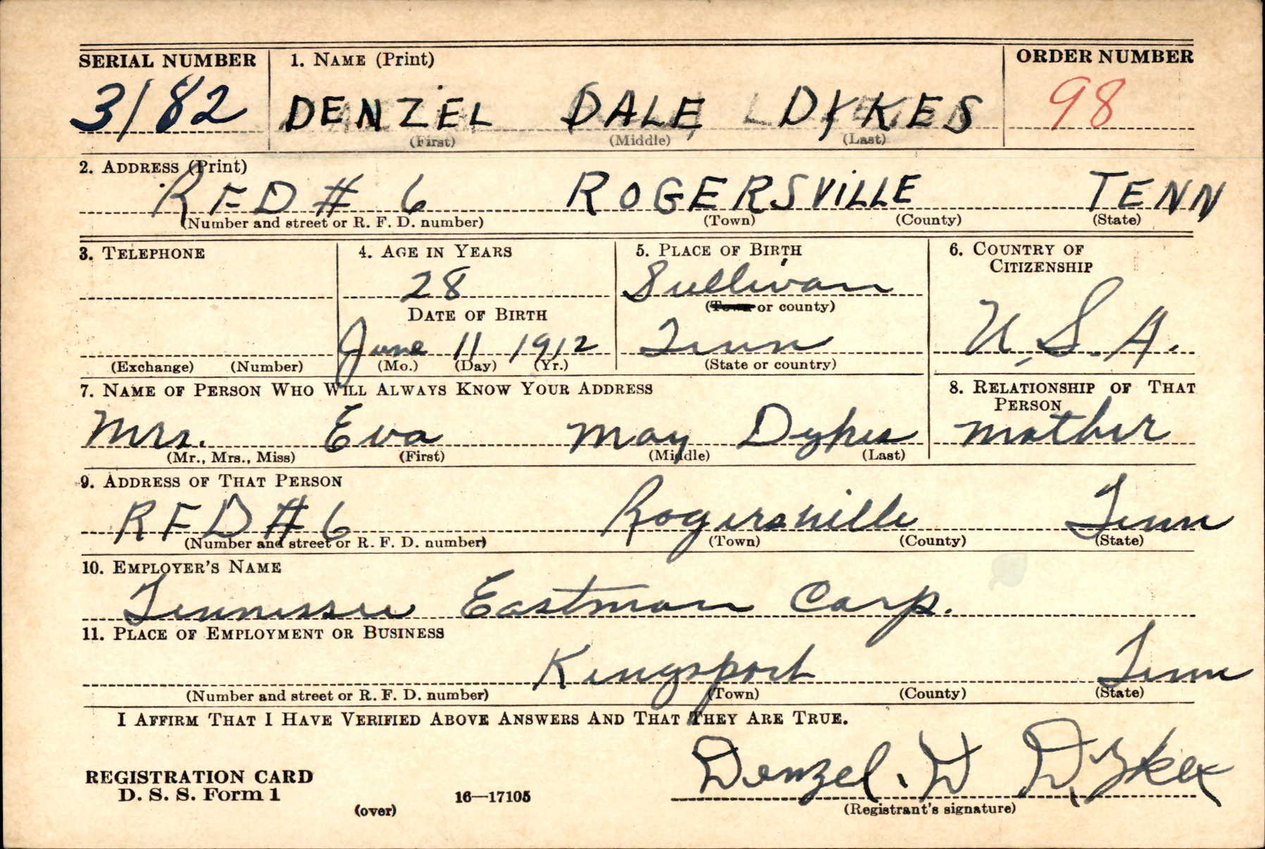 Denzel Dale Dykes was born on 11 June 1912, Tennessee, the son of Elbert Jasper Dykes and Eva May Whetsel