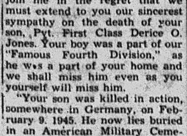 “The Officers and Enlisted men of the 23nd Infantry Regiment, join me in the regret that we must extend to you our sincerest sympathy on the death of your son, Pvt. First Class Derice O. Jones. Your boy was a part of our “Famous Fourth Division”, as he was a part of your home and we shall miss him even as you yourself will miss him. Your son was killed in action, somewhere in Germany on February 9, 1945. He now lies buried in an American Military Cemetery in Belgium. Appropriate burial services were conducted for him by a Protestant Army Chaplain. As a soldier, your boy bravely fought and bravely died, to stamp out the threat of slavery which hangs over the world today. As a member of our great Allies Armies, he brougt liberation, new hope and new life to Nations that have been insulted, robbed, tortured, defiled and enslaved by their conquerors. With such courage and strength in his heart he walked humbly with his God, and was therefore worthy to conquer. Almighty God has received your son’s Supreme Sacrifice. It is, therefore, with the utmost confidence that we offer to God this fervent prayer for your boy. May the angels receive him at his coming and lead him into Paradise where he may have rest everlasting.As we pray for you and your son, we, the buddies of your boy, ask a rememberance in your prayers for those of us who still fight on.”