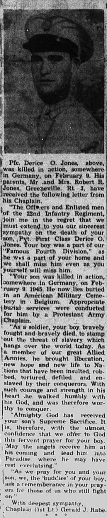 Pfc. Derice O. Jones was killed in action, somewhere in Germany on February 9. His parents, Mr. and Mrs. Robert R. Jones, Greeneville, Rt. 3, have received the following letter from his Chaplain.