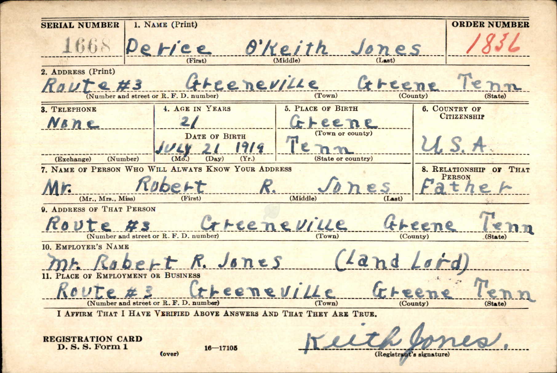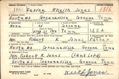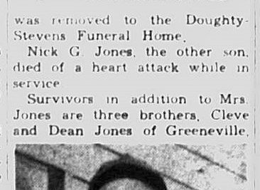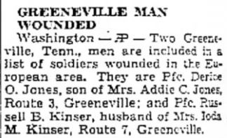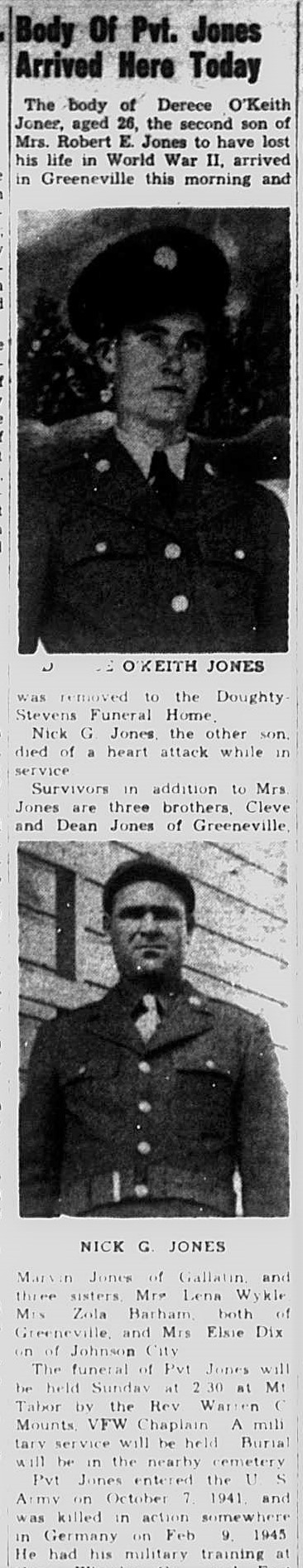 The body of Derece O’Keith Jones, aged 26, the second son of Mrs. Robert E. Jones to have lost his life in World War II, arrived in Greeneville this morning and was removed to the Doughty-Stevens Funeral Home. Nick G. Jones, the other son, died of a heart attack while in service. Survivors in addition to Mrs. Jones are three brothers, Cleve and Dean Jones of Greeneville, Marvin Jones of Gallatin and three sisters, Mrs. Lena Wykle, Mrs. Zola Barham, both of Greeneville, and Mrs. Elsie Dixon of Johnson City. The funeral of Pvt. Jones will be held Sunday at Mt. Tabor. Burial will be in the nearby cemetery. Pvt. Jones entered the U.S. Army on October 7, 1941 and was killed in action somewhere in Germany on Feb. 9, 1945. He had his military training at Camp Wheeler, Ga. And Fort Jackson, S.C.