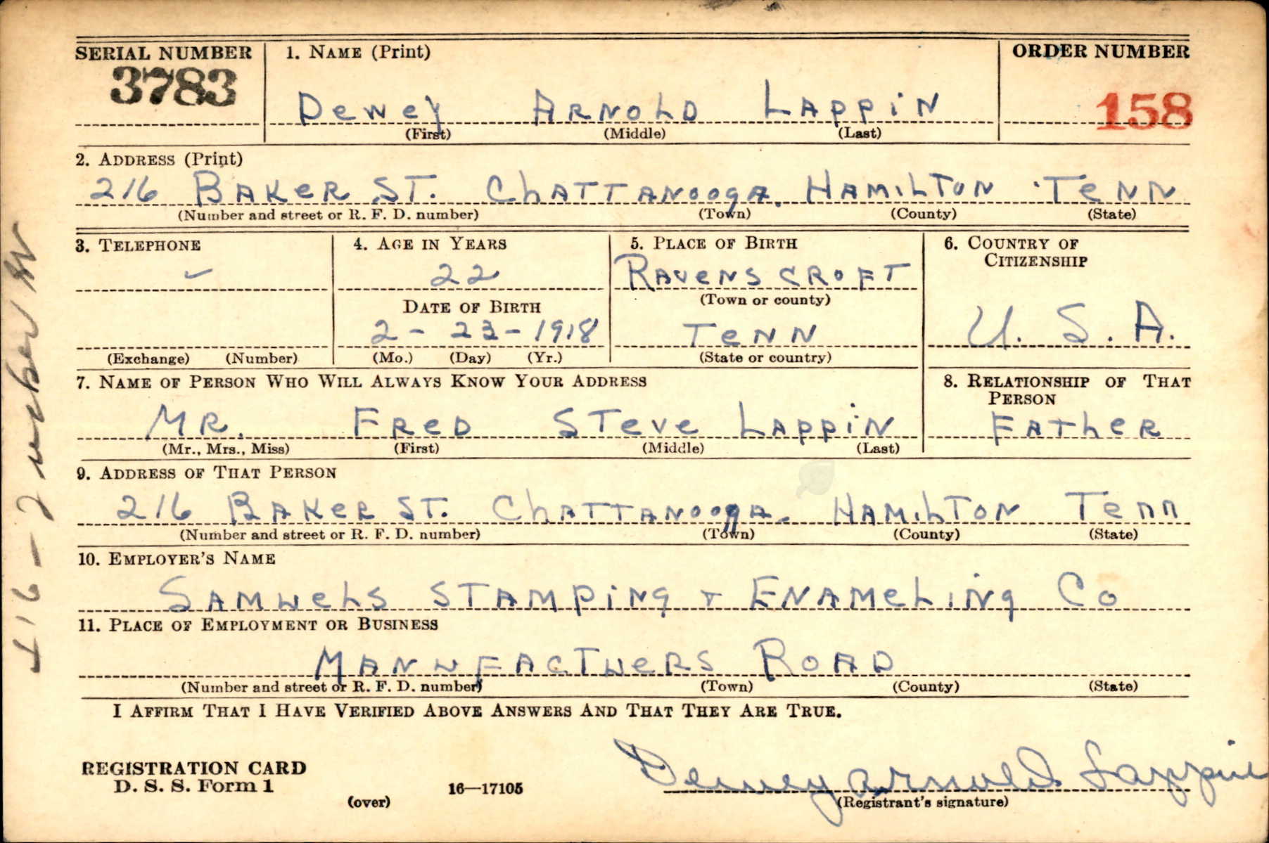 Dewey Arnold Lappin was born at Ravens Croft, Tennessee, the son of Fred Steve Lappin and Gertrude Dubois.