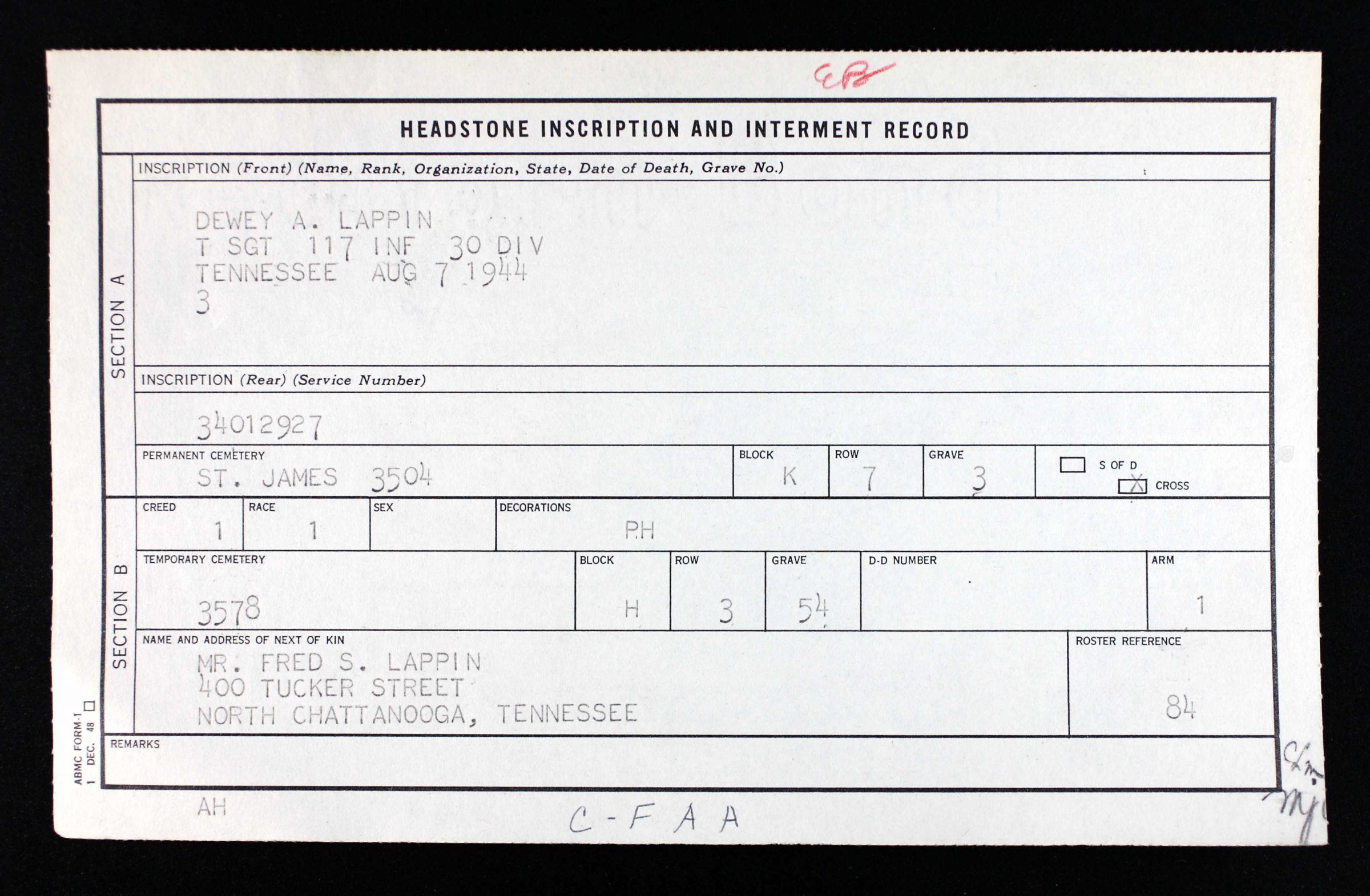 T/Sgt Lappin served with Company C, First Battalion, 117th Infantry, 30th Division in the European theater; Normandy and Northern France. He was Killed in Action.