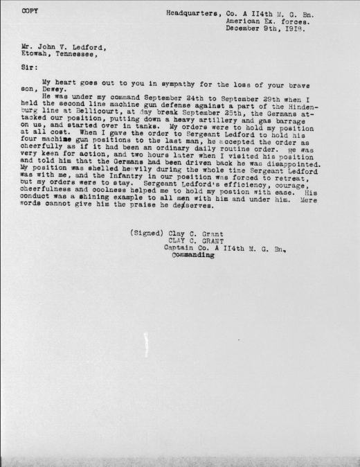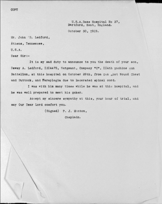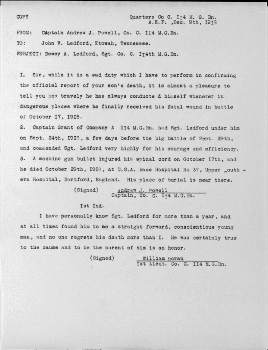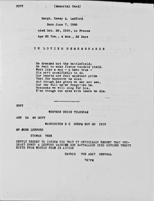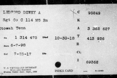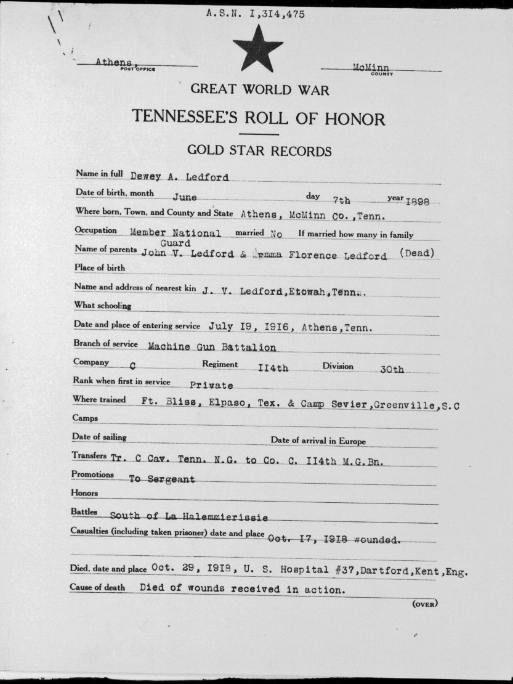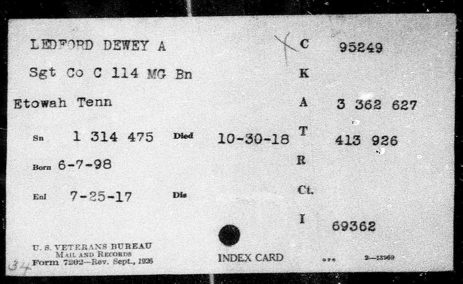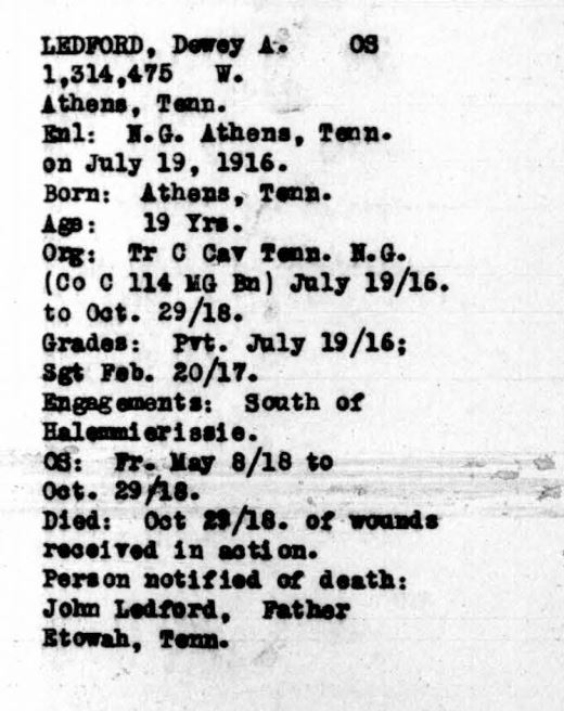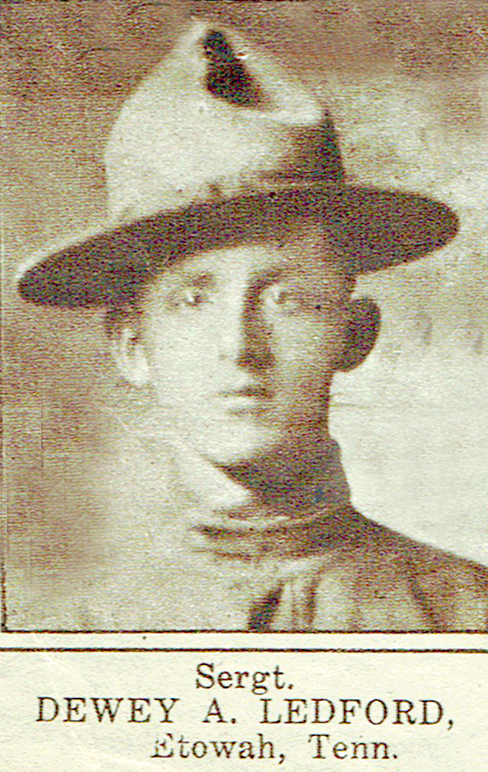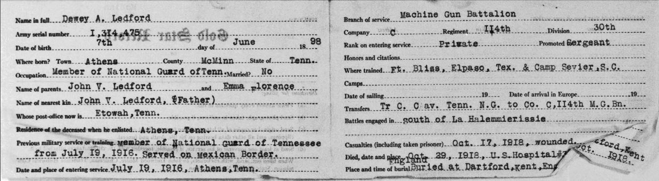 Sergeant Dewey A. Ledford was born in Athens, Tennessee. He served in the 114th Machine Gun Battalion of the 29th Division. He died of wounds in England on the 29th of October 1918 at the age of 19. He is interred at B,3,4 Brookwood American Cemetery, Brookwood, England.