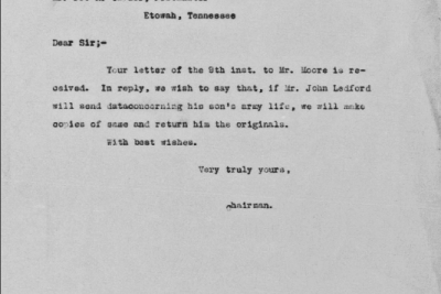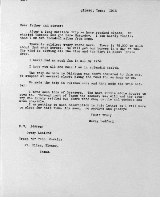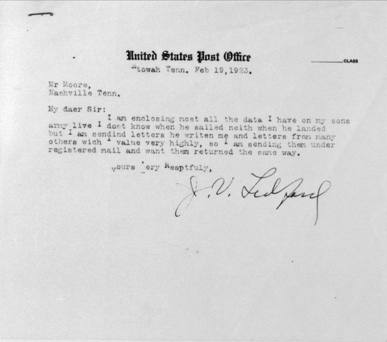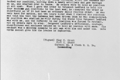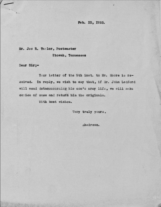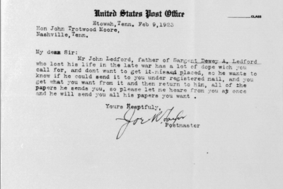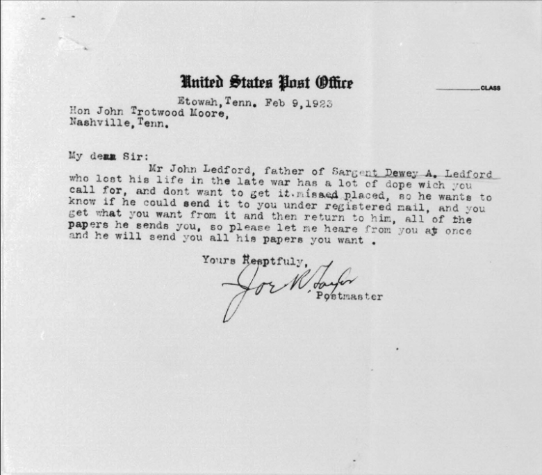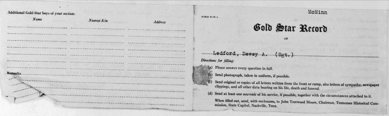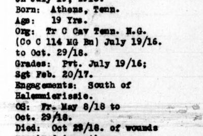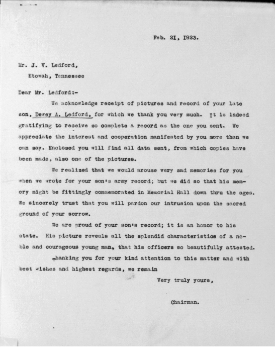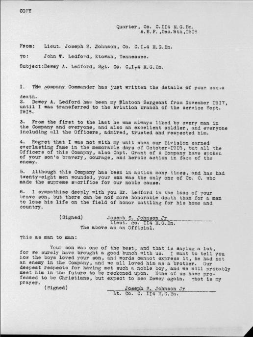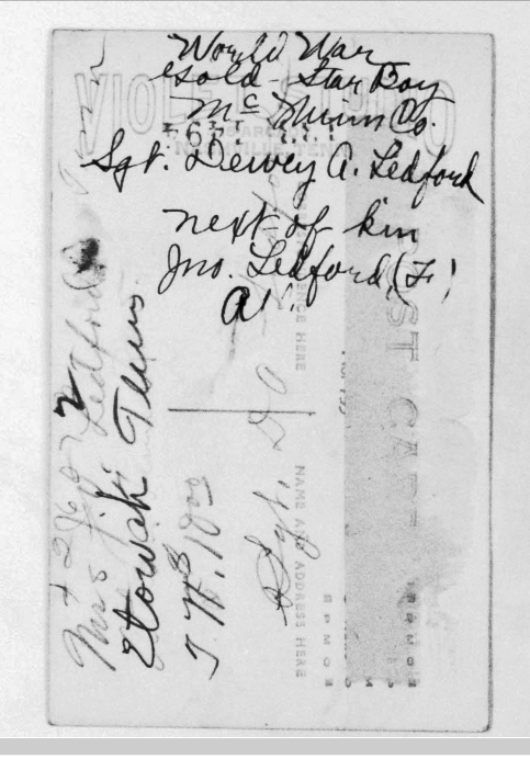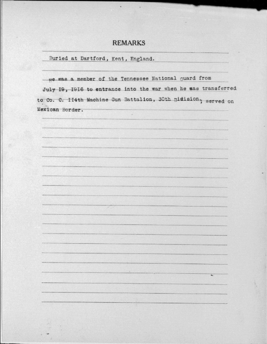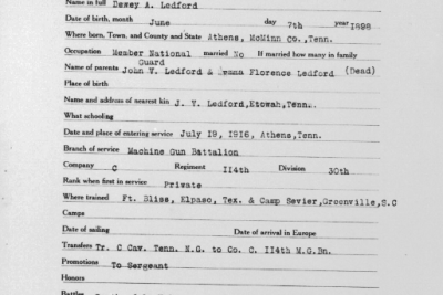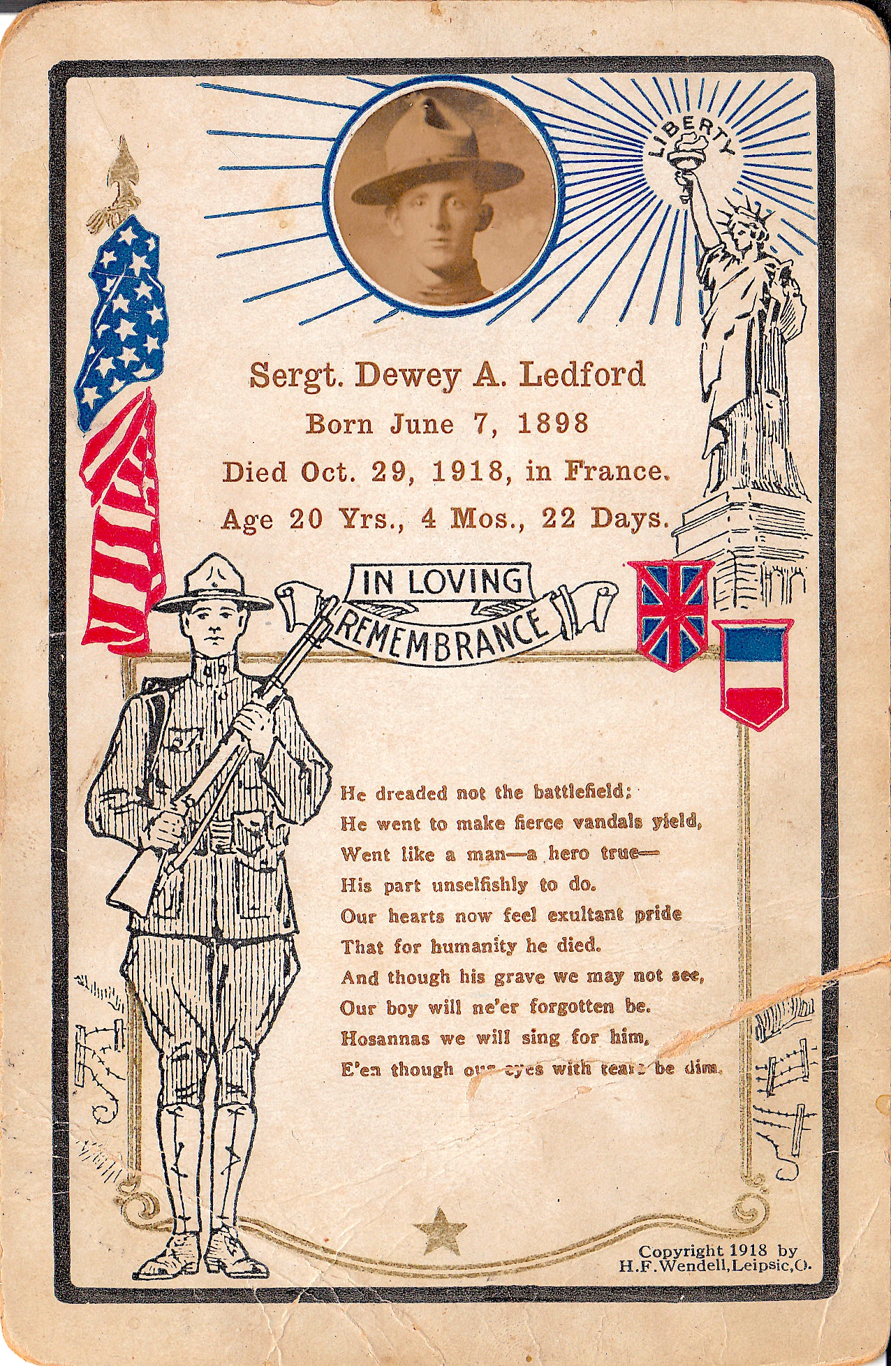 Sergeant Dewey A. Ledford was born in Athens, Tennessee. He served in the 114th Machine Gun Battalion of the 29th Division. He died of wounds in England on the 29th of October 1918 at the age of 19. He is interred at B,3,4 Brookwood American Cemetery, Brookwood, England.