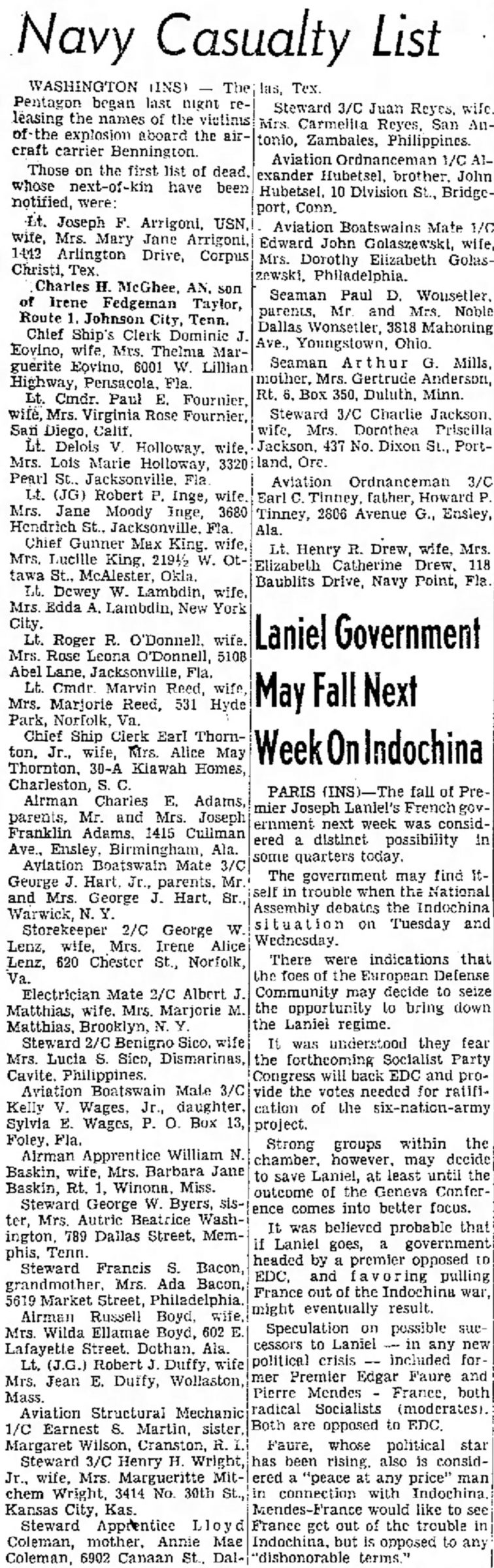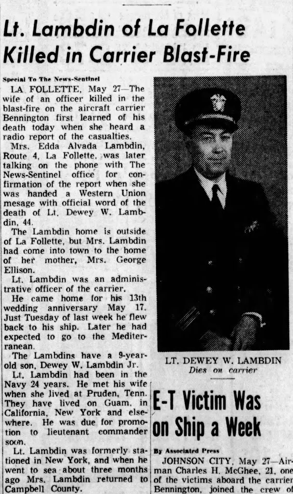 Lt Lambdin USN started as a Seaman Recruit in the year 1930 and remained a career Navy until 1954, when he was killed while serving as an Administrative Officer on board the USS Bennington.. May 26, 1954, fighter jets started to catapult into the air from the USS Bennington (CVA 20) An explosion off the coast of Rhode Island occurred. 104 officers and men died in the explosion and 139 others injured. A memorial plaque was dedicated in Newport to those who perished in this incident. The Navy designated the tragedy as the second worst disaster aboard a naval vessel not caused by enemy action in naval history.