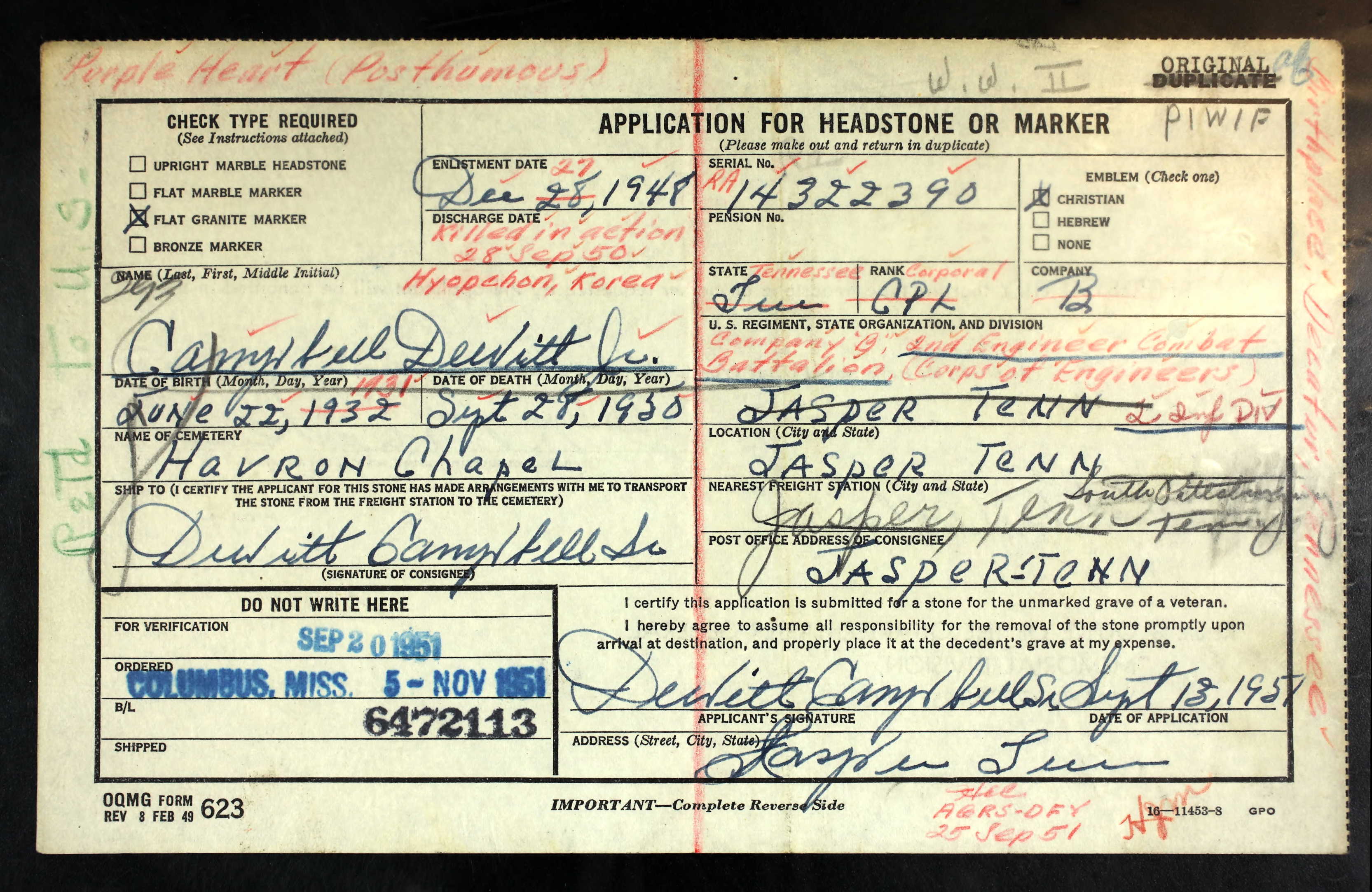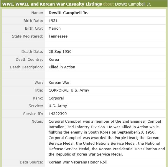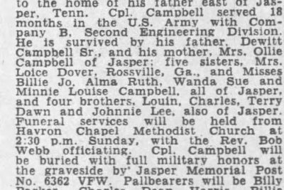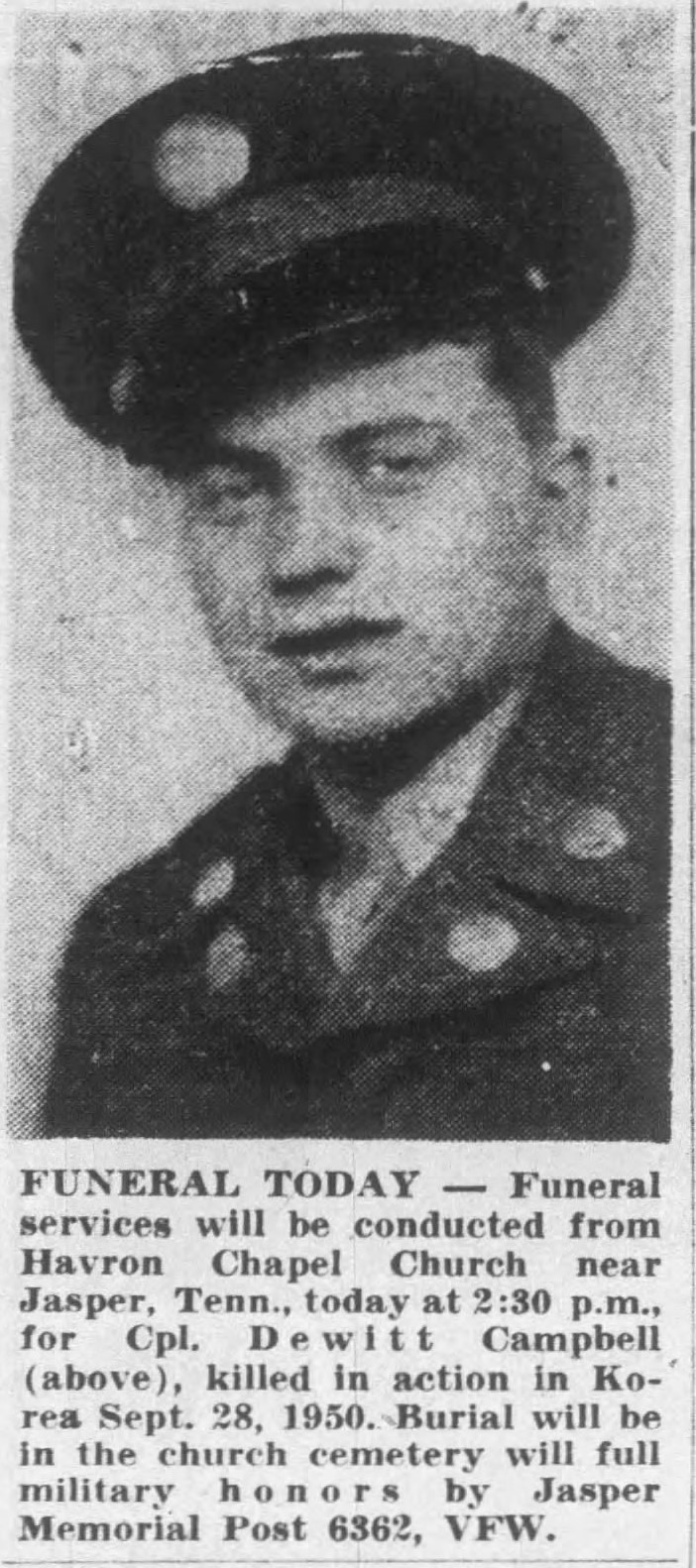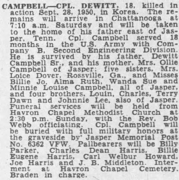 Cpl. Dewitt Campbell, 18, killed in action Sept. 28, 1950, in Korea. The remains will arrive in Chattanooga at the home of his father East of Jasper, Tenn. Cpl. Campbell served 18 months in the U.S. Army with Company B, Second Engineering Division. He is survived by his father, Dewitt Campbell Sr., and his mother, Mrs. Ollie Campbell of Jasper; five sister, Mrs. Loice Dover, Rossville, Ga., and Misses Billie Jo, Alma Ruth, Wanda Sue and Minnie Louise Campbell, all of Jasper, and four brothers, Louin, Charles, Terry Dawn and Johnnie Lee, also of Jasper.