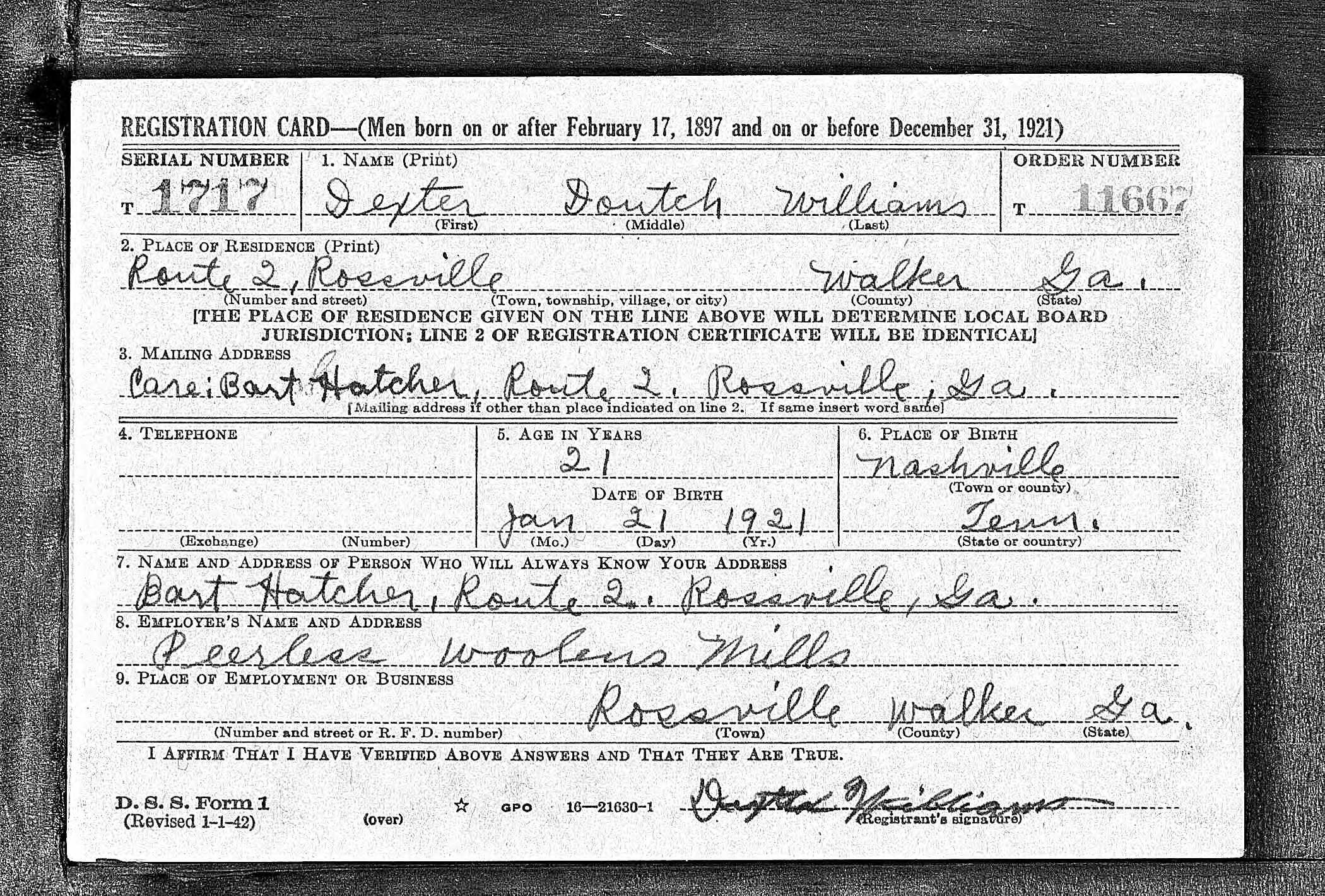 Dexter Dantch Wiliams was born in Nashville, Tennessee to Edward James Williams and Maggie Rhea Byrd. He was married to Hazel Lee Williams but they filed for divorce in 1943.