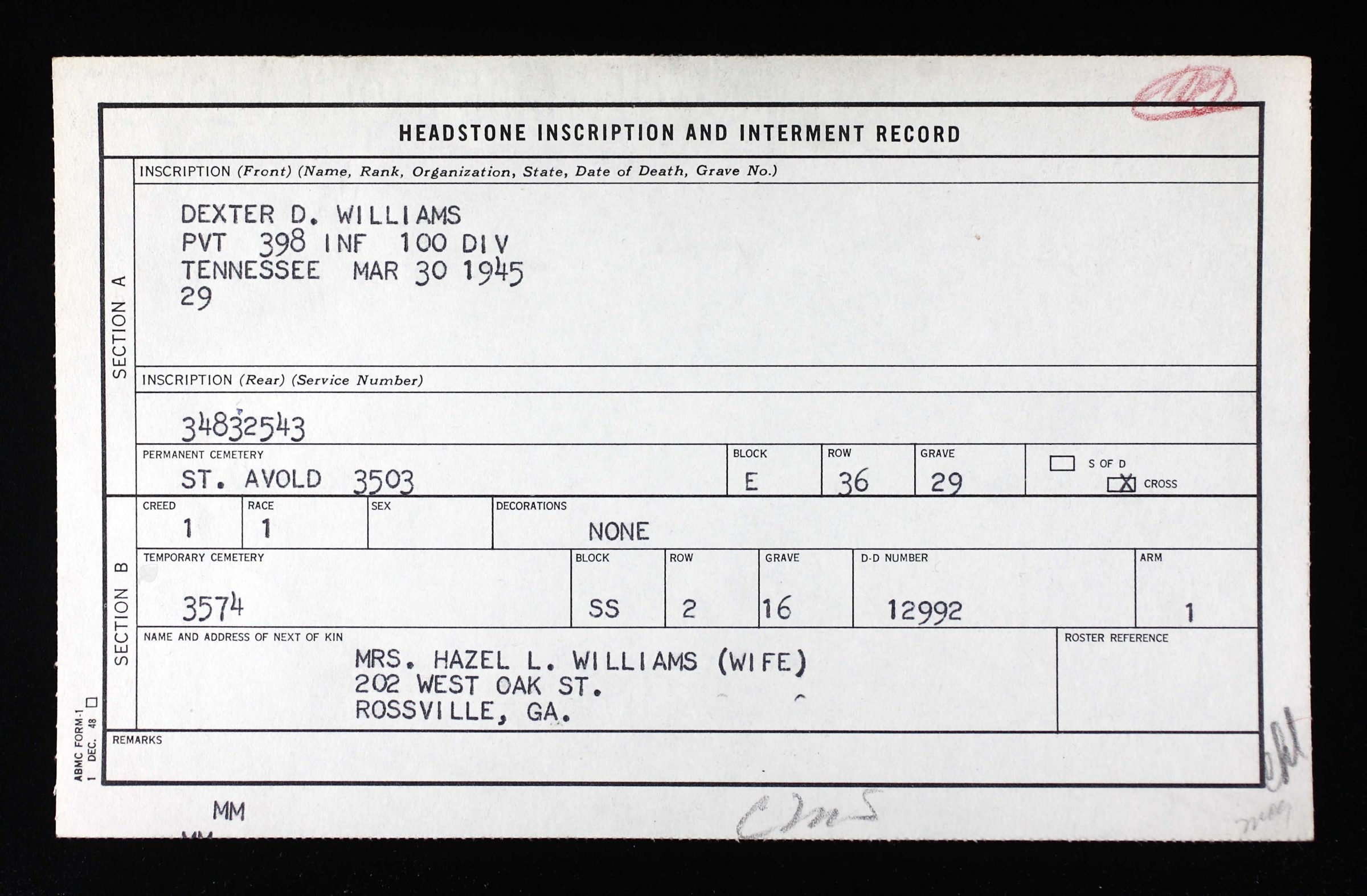 Killed in action was Pvt. Dexter D. Williams, son of Mrs. Bart Hatcher, Hargraves Avenue, Rossville. Pvt Williams was killed while participating in action against the enemy with a Seventh Army infantry unit in France March 30, his mother was officially notified. A former student of the Rossville Schools and an employe of the Columbian Iron Works, he entered the army in 1943 and was assigned to foreign duty in July, 1944. He is survived by his mother; father, E.J. Williams, Port Arthur, Texas; two sisters, Mrs. Nadine N. Brooks, 4308 Bennett Road; Mrs. Andy Daffron and two brothers, E.J. Williams Jr. and Virgil Williams.