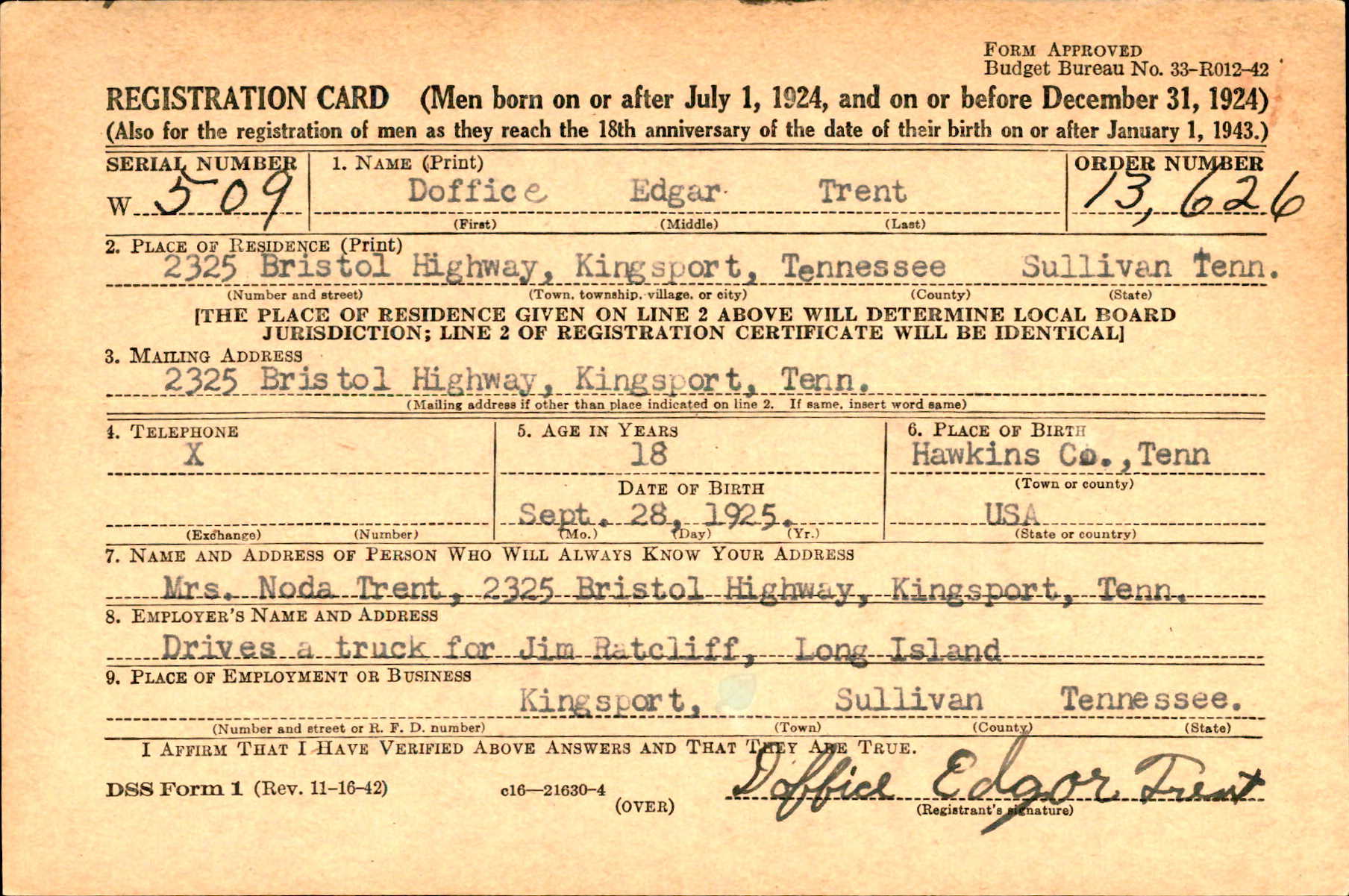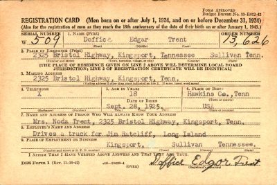 Doffice Edgar Trent was born on 28 September 1925 in Rogersville, Tennessee. He was the son of Thomas Parrott Trent and Noda Jane Shaw.