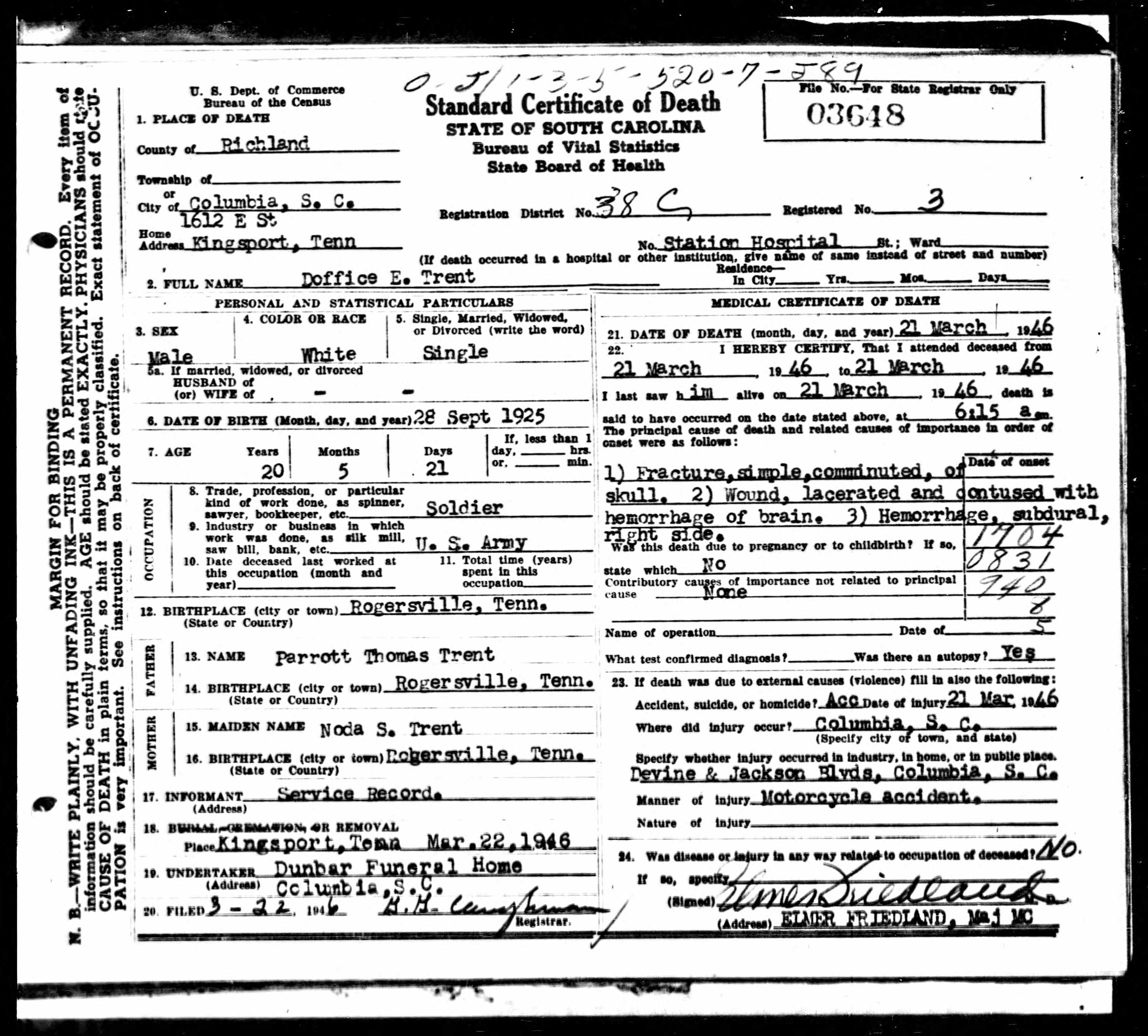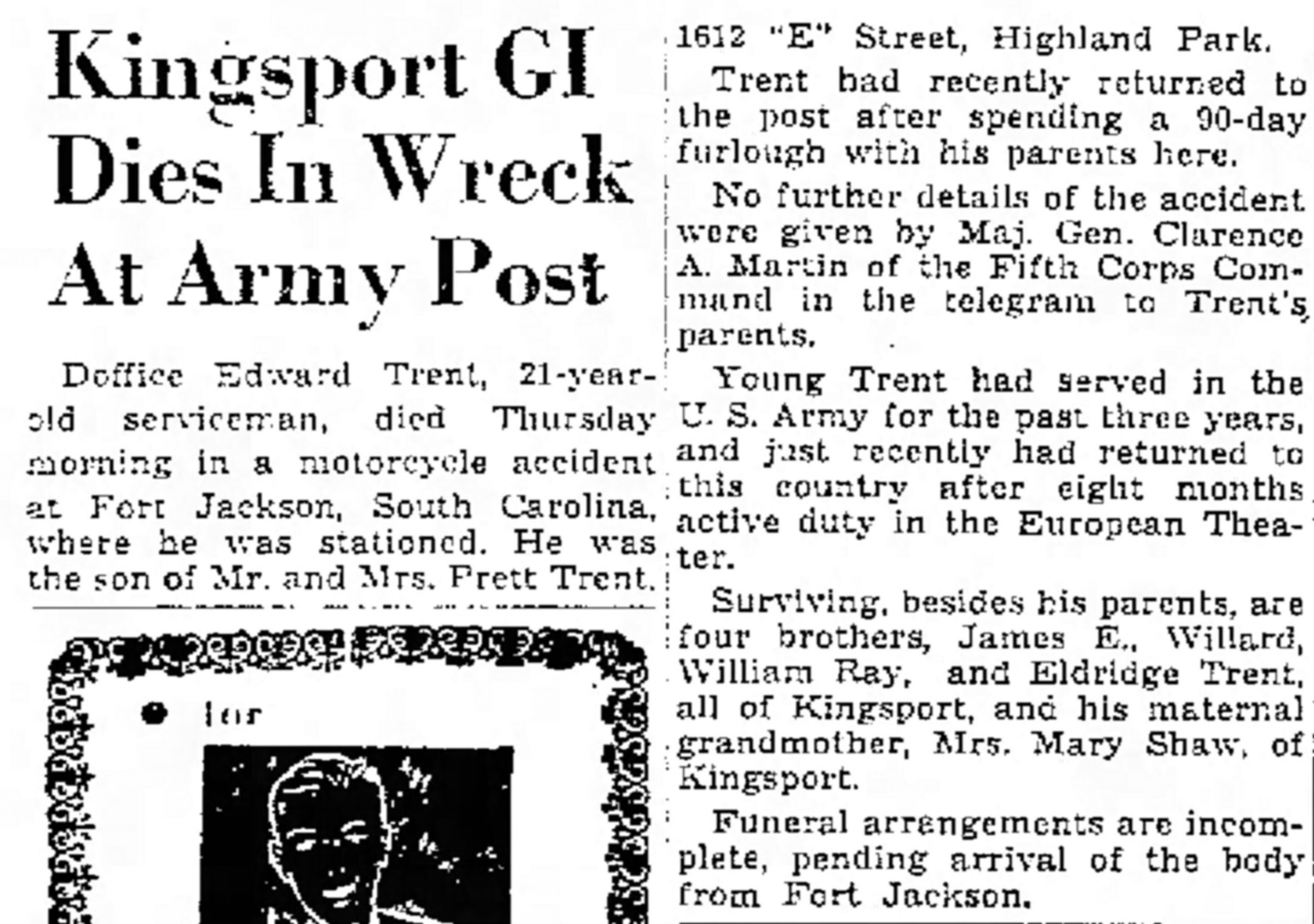 PFC Trent died at the Station Hospital at Columbia, Richland County, South Carolina of injuries caused by a motorcycle accident at Devine & Jackson Blvds, Columbia, S.C. Pfc. Trent had served in the Army for the past three years and just had returned to the States after eight months of active duty in the European Theater.