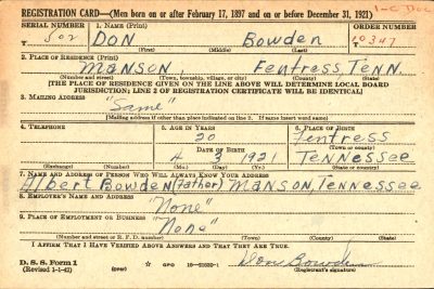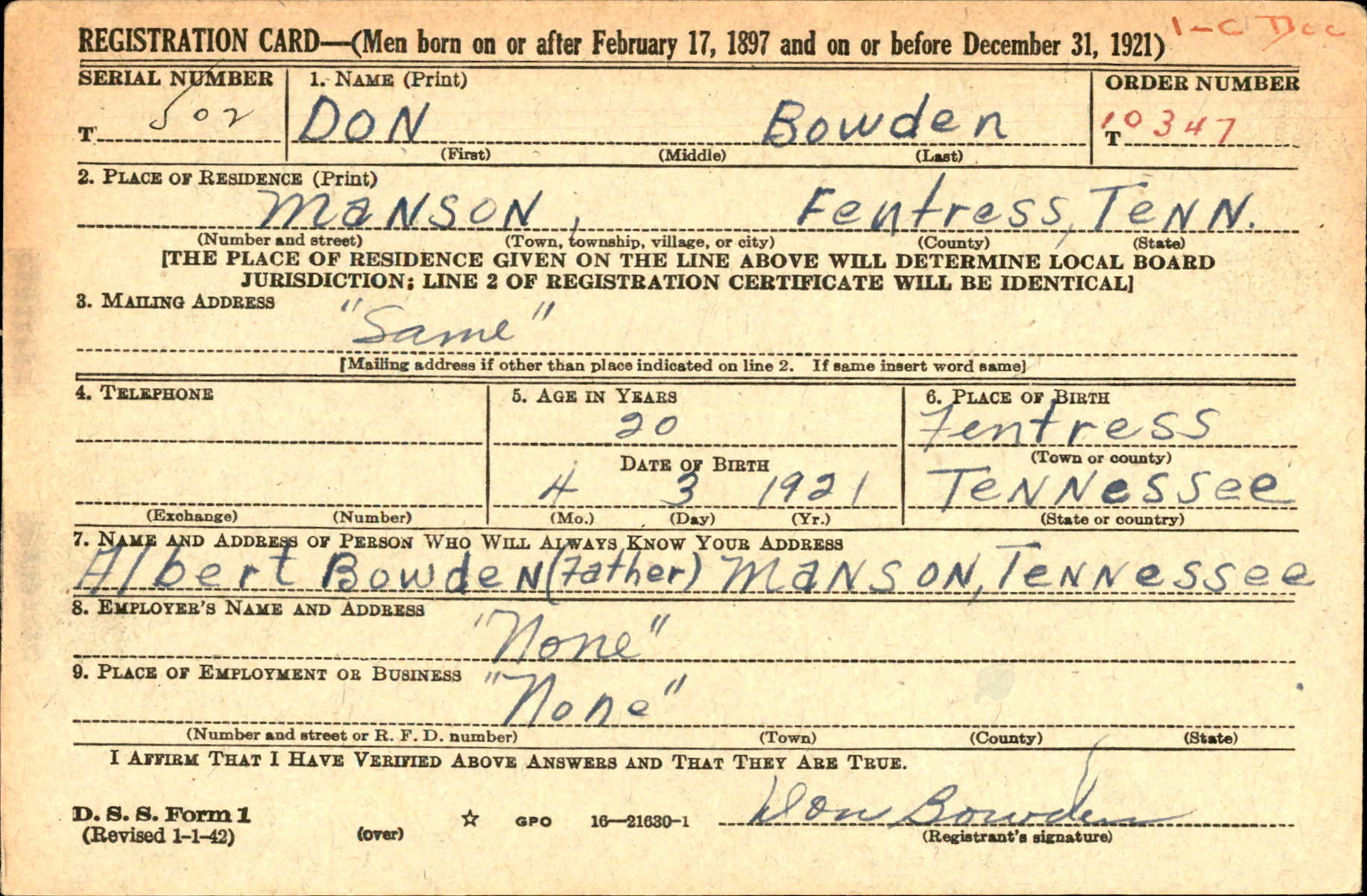 Don Bowden was born on 3 April 1921, the son of Albert Hughston Bowden and Ines Maggie Delk.