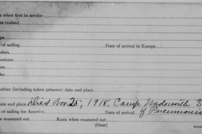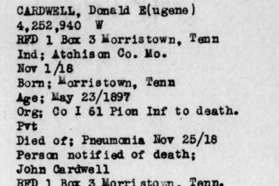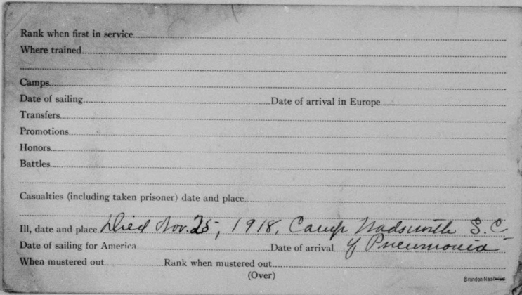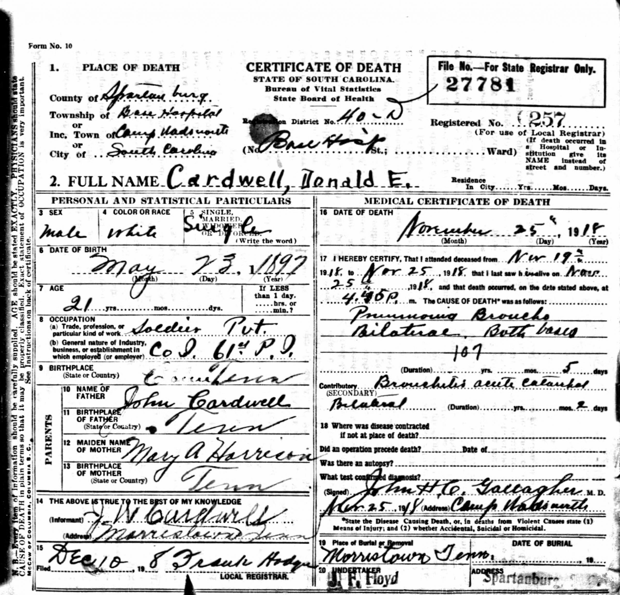 Private Cardwell died 25 November 1918 at Spartanburg, Base Hospital, South Carolina, from Pneumonia Broncho Bilateral.