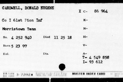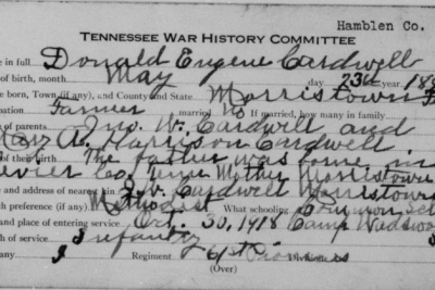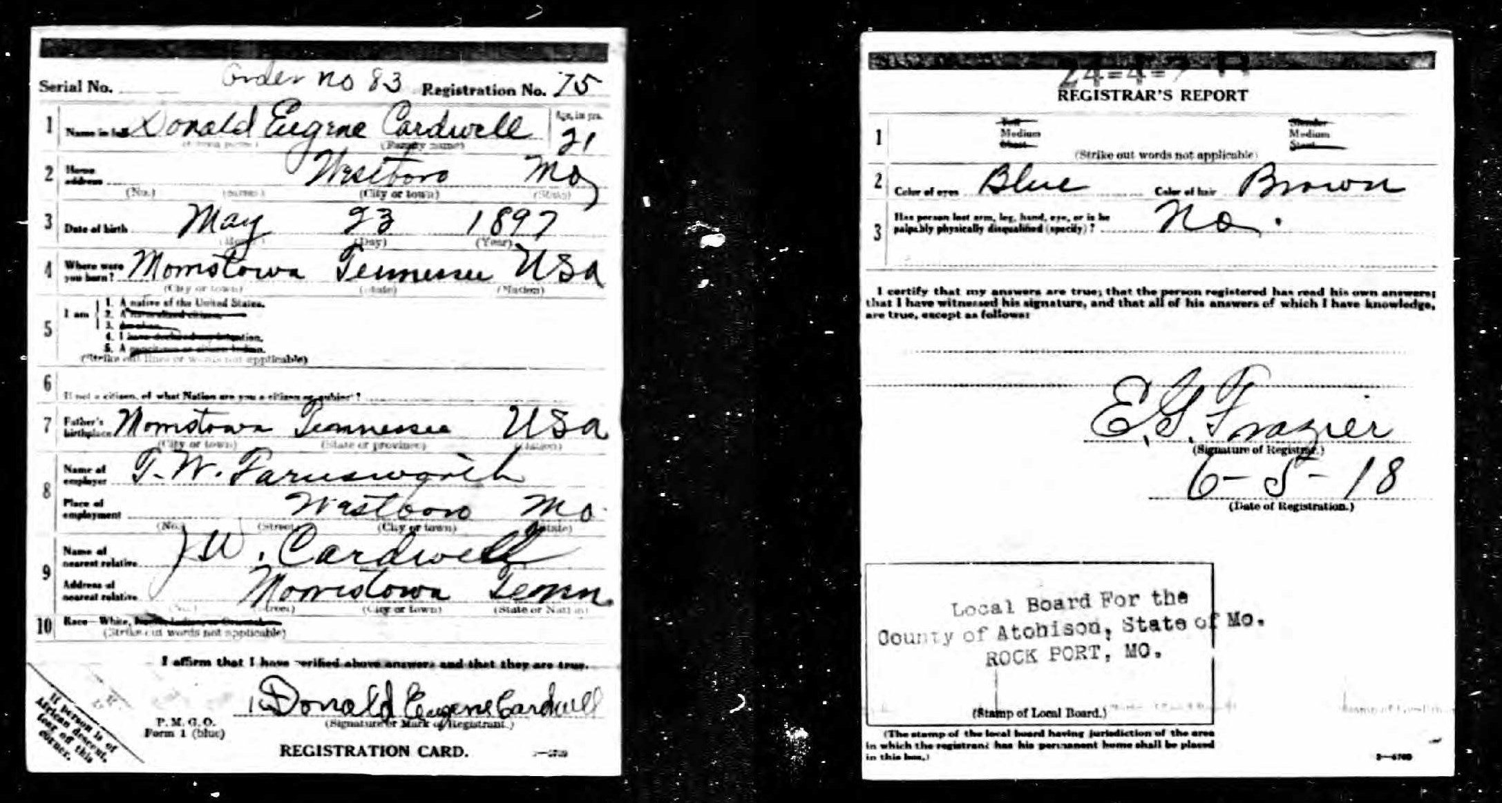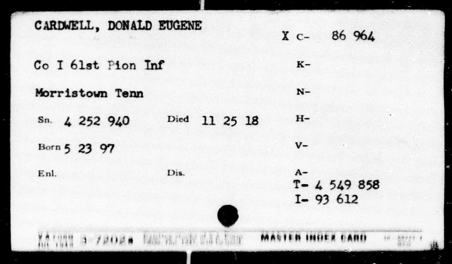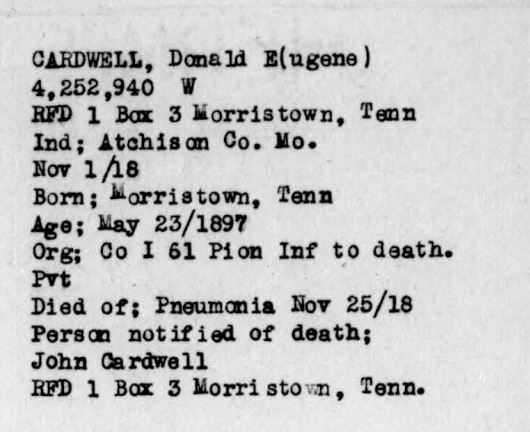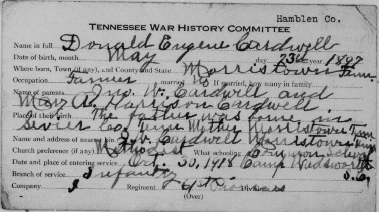 Donald Eugene Cardwell was born 23 May 1897, Morristown, Tennessee to John Cardwell and Mary A. Harrison.