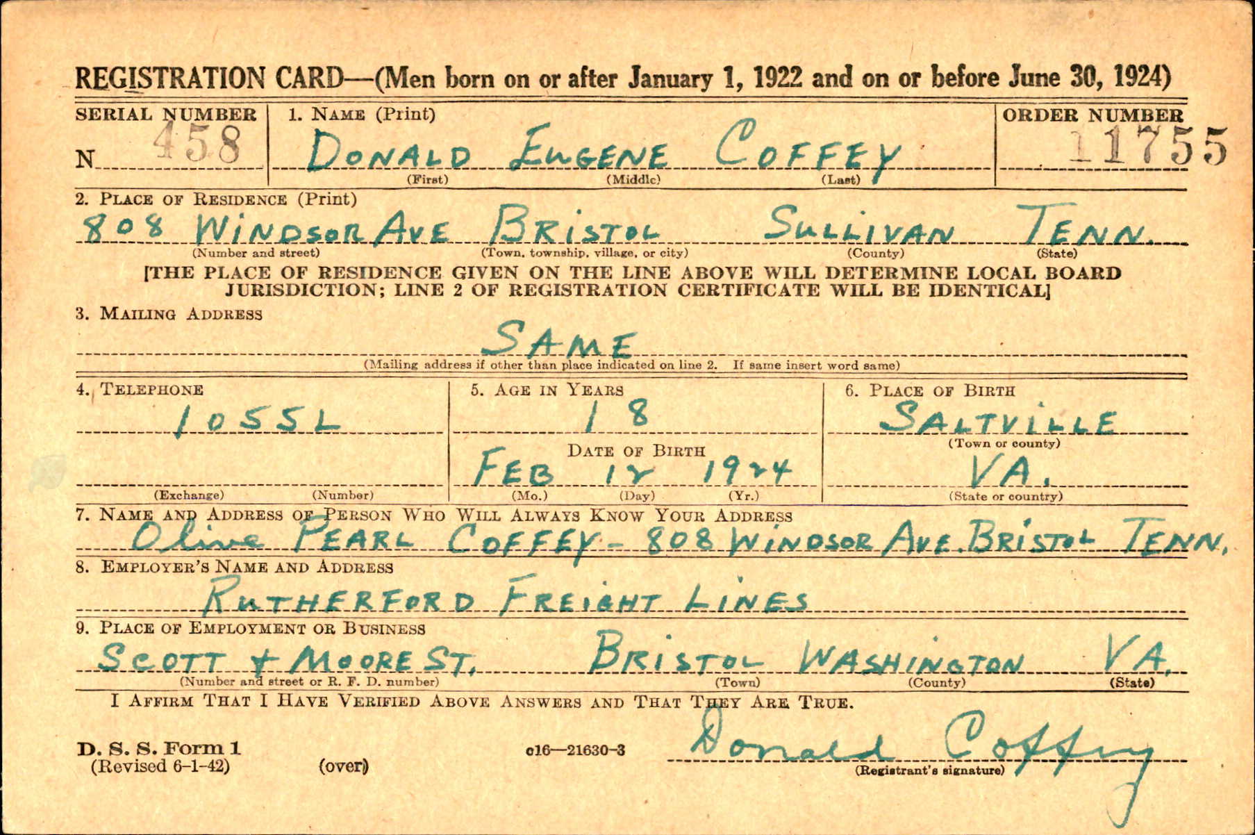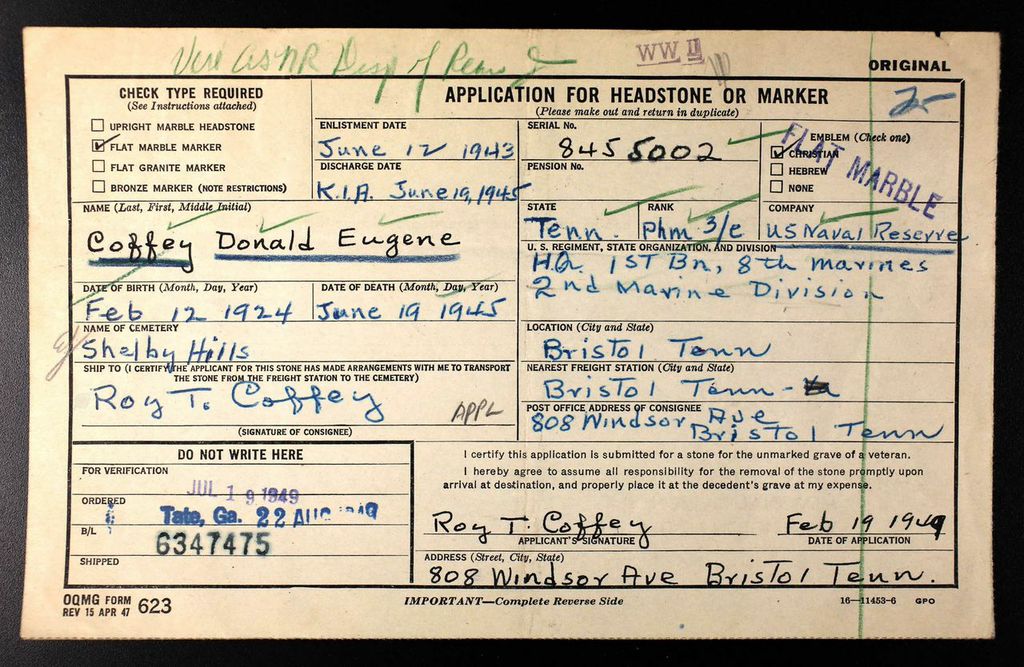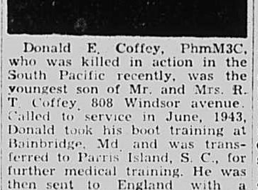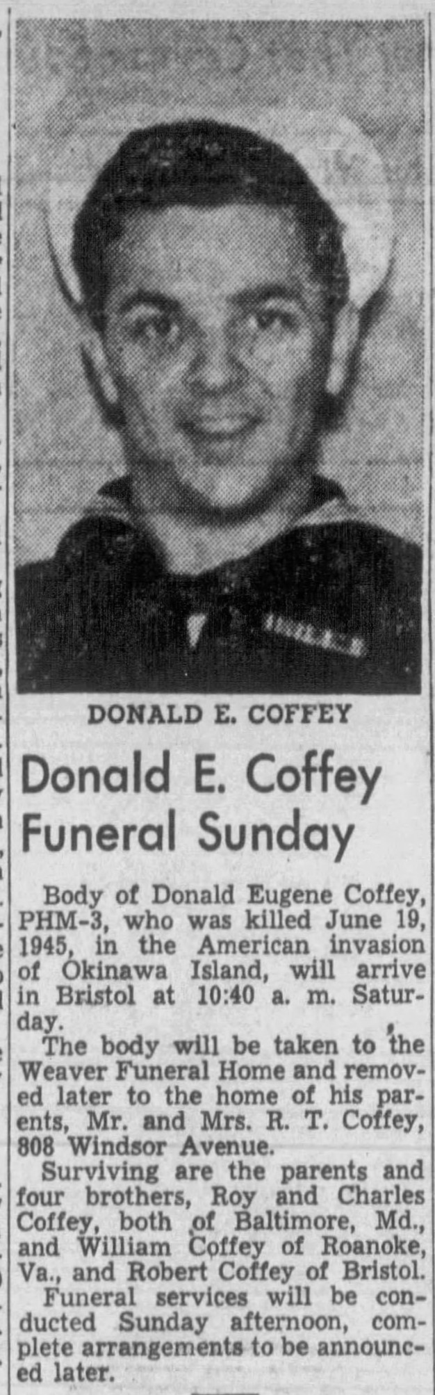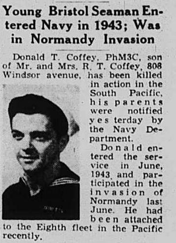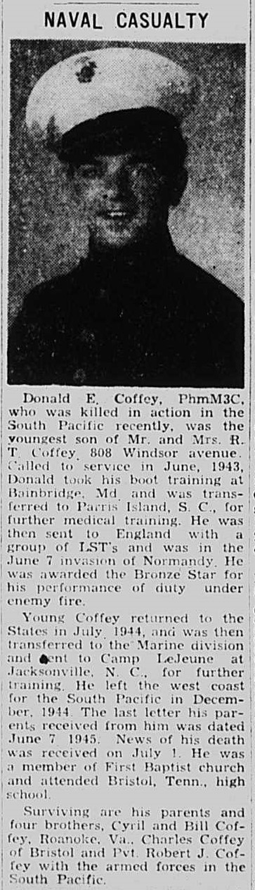Donald Eugene Coffey was born on 12 February 1924 in Saltville, Virginia. He was the son of Roy Temperance Coffey and Olive Pearl Hurt.