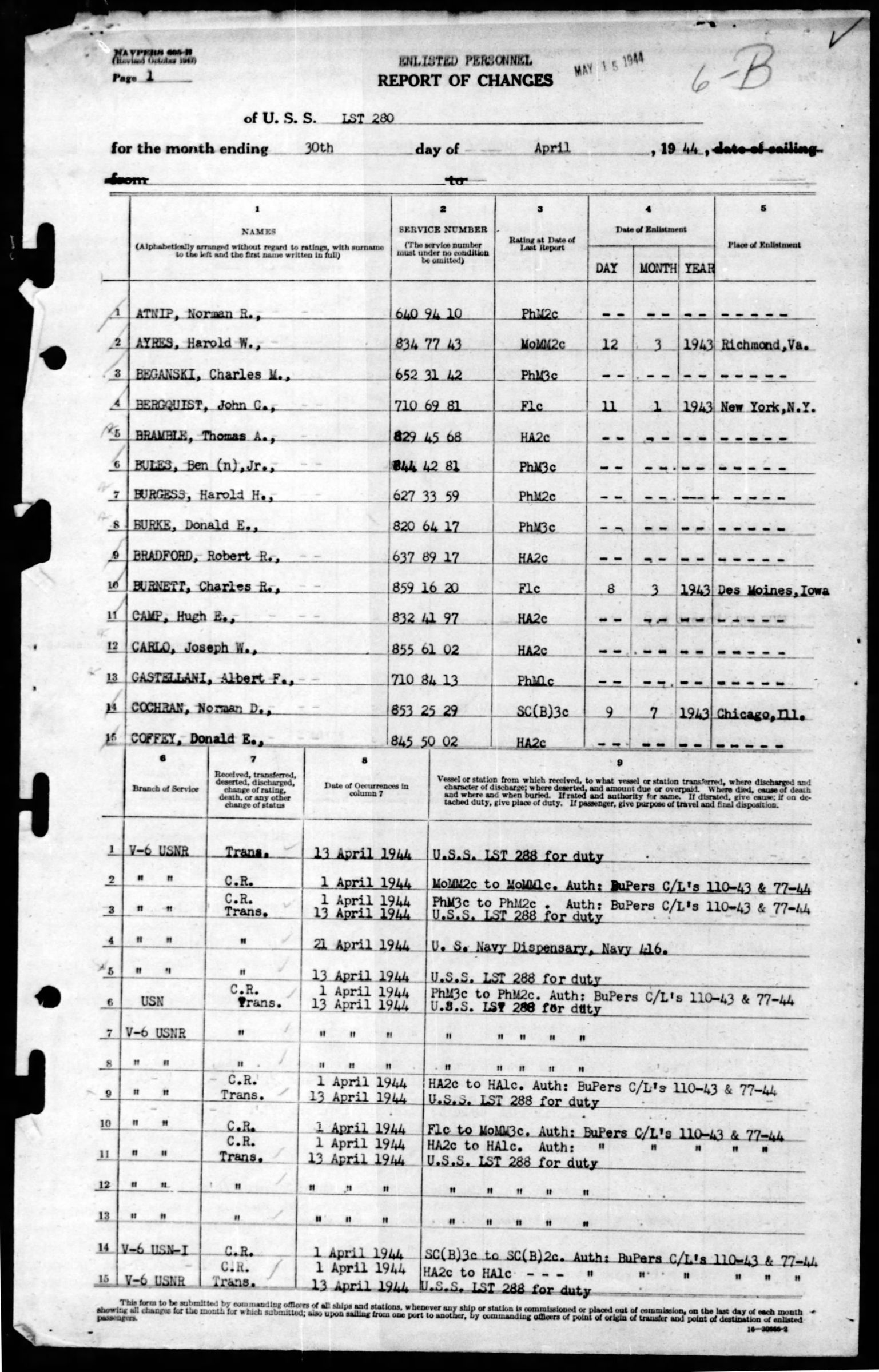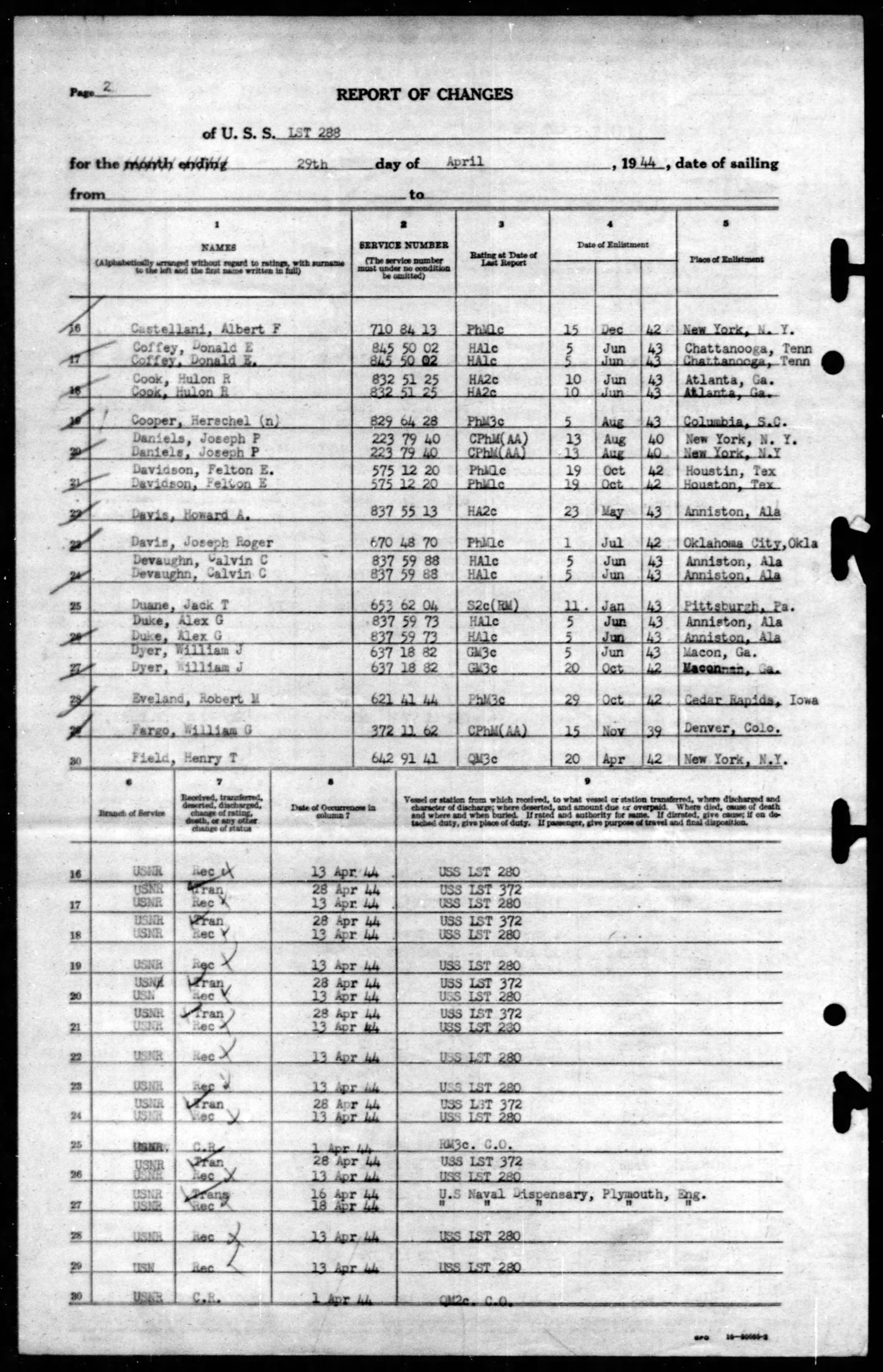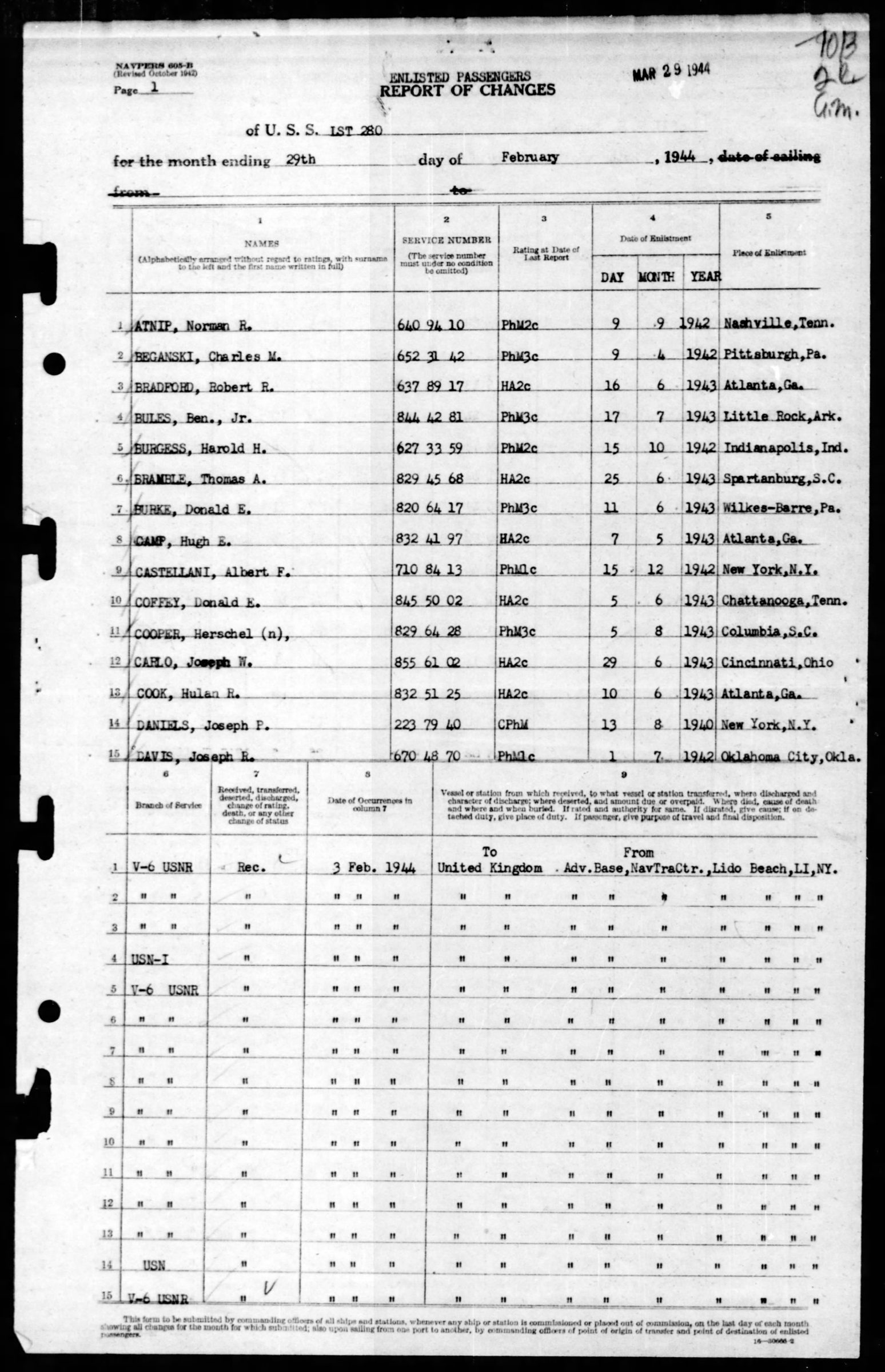 He was a passenger on the U.S.S. LST 280 received on 3 February 1944 from Adv.Base, NavTraCtr., Lido Beach, LI, NY, sailing to the United Kingdom. He was transferred to the U.S.S. LST 288 for duty on 13 April and transferred to the LST 372 on 28 April 1944.