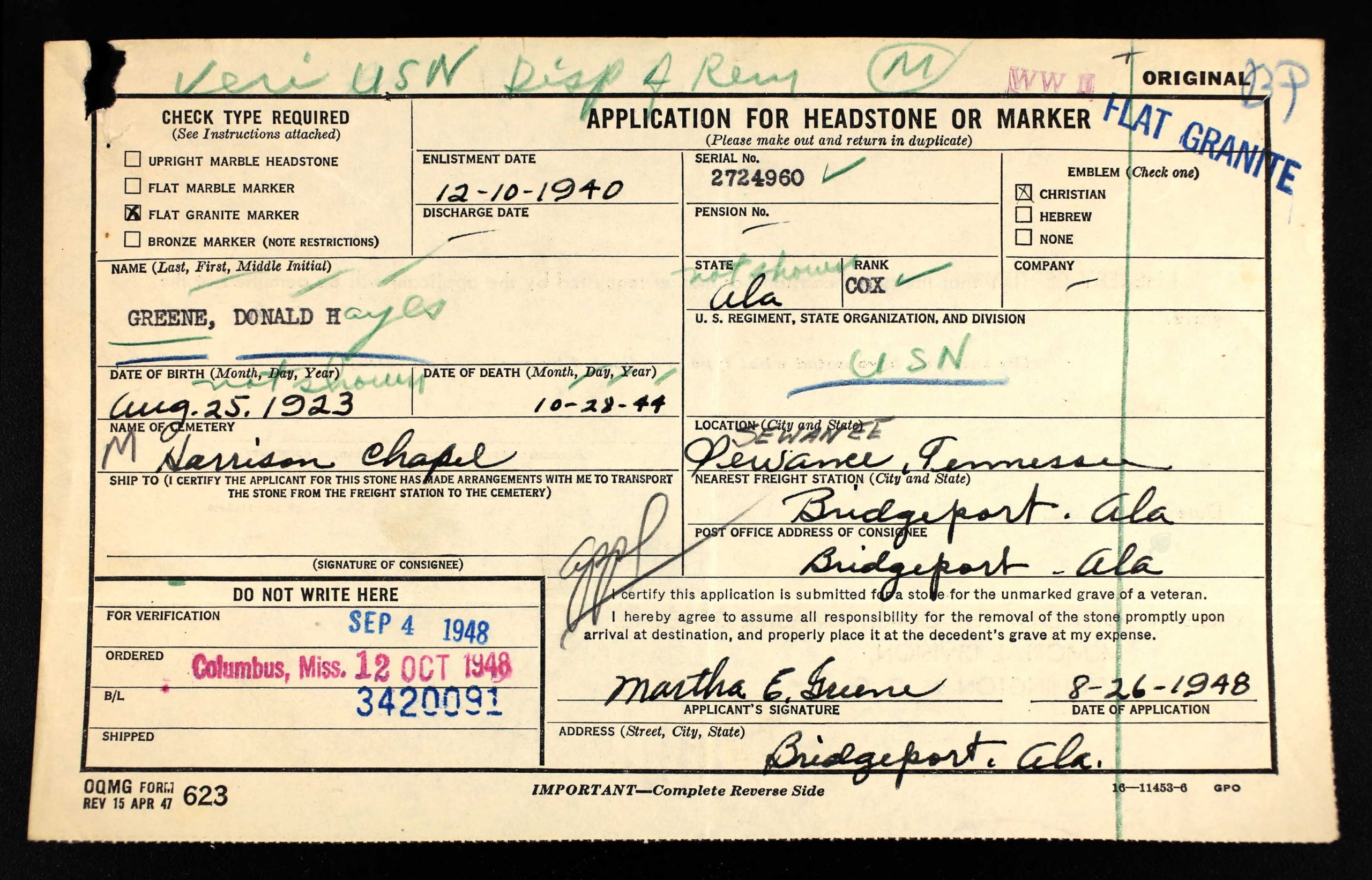 Donald Hayes Greene was the son of Roy Lee Green and Martha E Foster of 4214 St, Elmo Avenue, Chattanooga.
