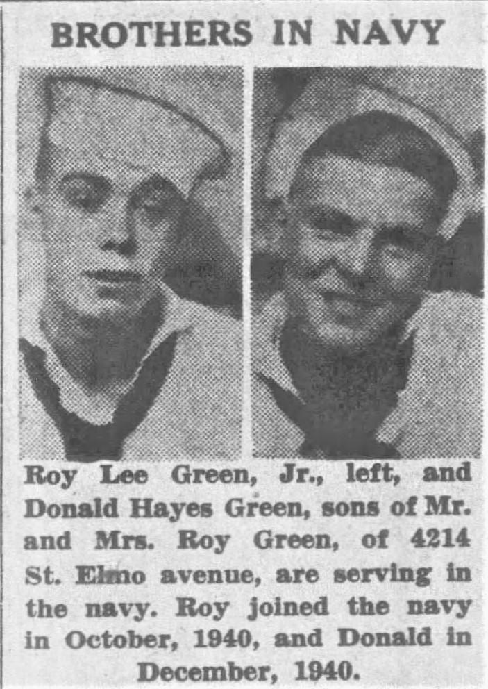 Killed in line of duty were Donald H. Green of the navy, son of Mr. and Mrs. R.L. Green, 4214 St. Elmo Avenue, and his uncle, Cpl. Edward E. Foster, 26, son of Mr. and Mrs. J.P. Foster, Sewanee, and husband of Mrs. Virginia Price Foster of Sewanee. Green was killed in line of duty on Oct. 28, the Navy Department informed his parents. He entered the navy in 1940, and served nearly four years overseas. He is survived by his parents; two sisters, Miss Patty R. Green, Chattanooga; Mrs. Rufus Timbs, Elgin Field, Ill., and one brother, Roy L. Green Jr., also of the navy.
