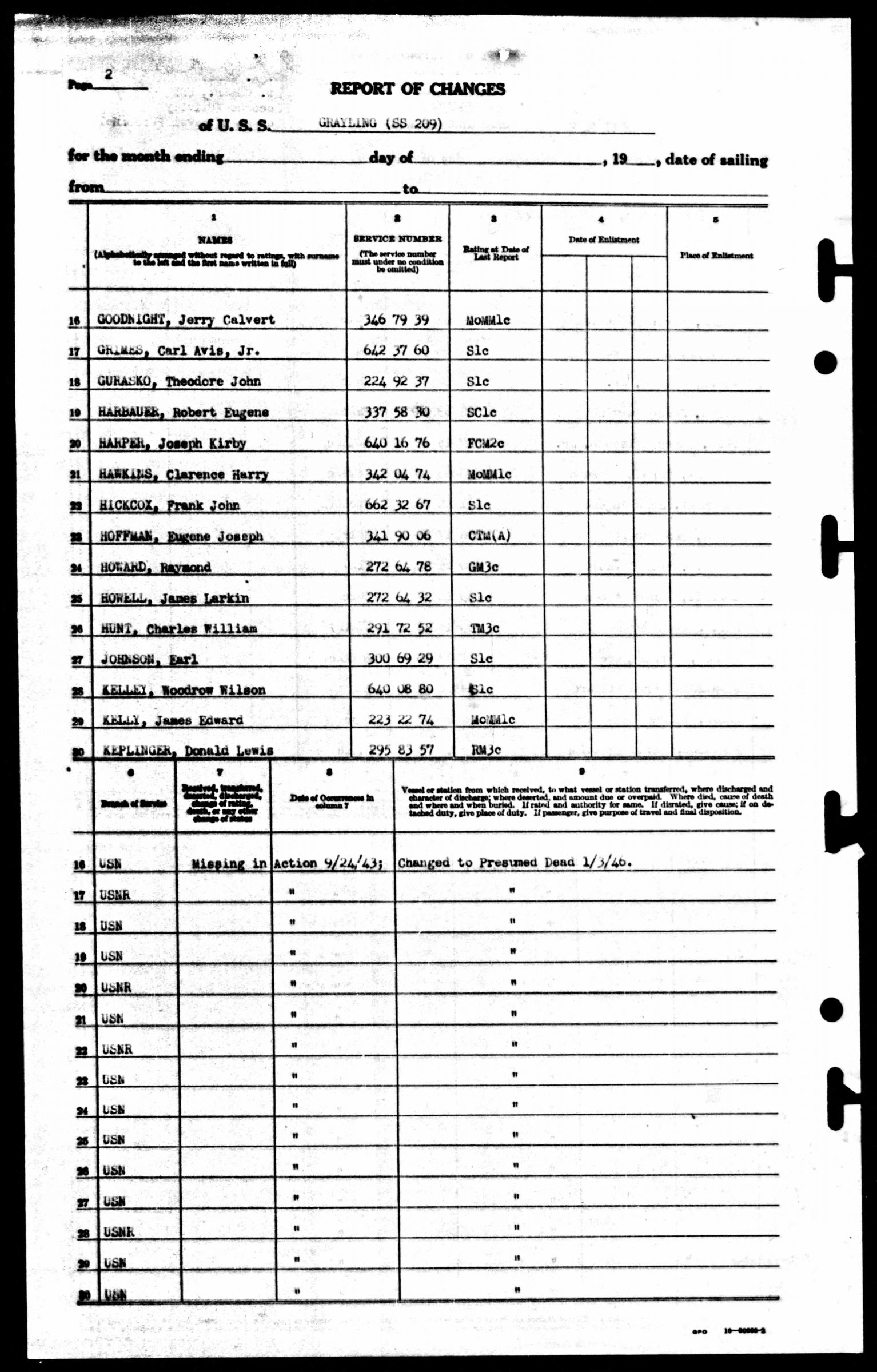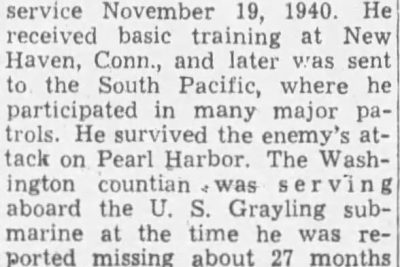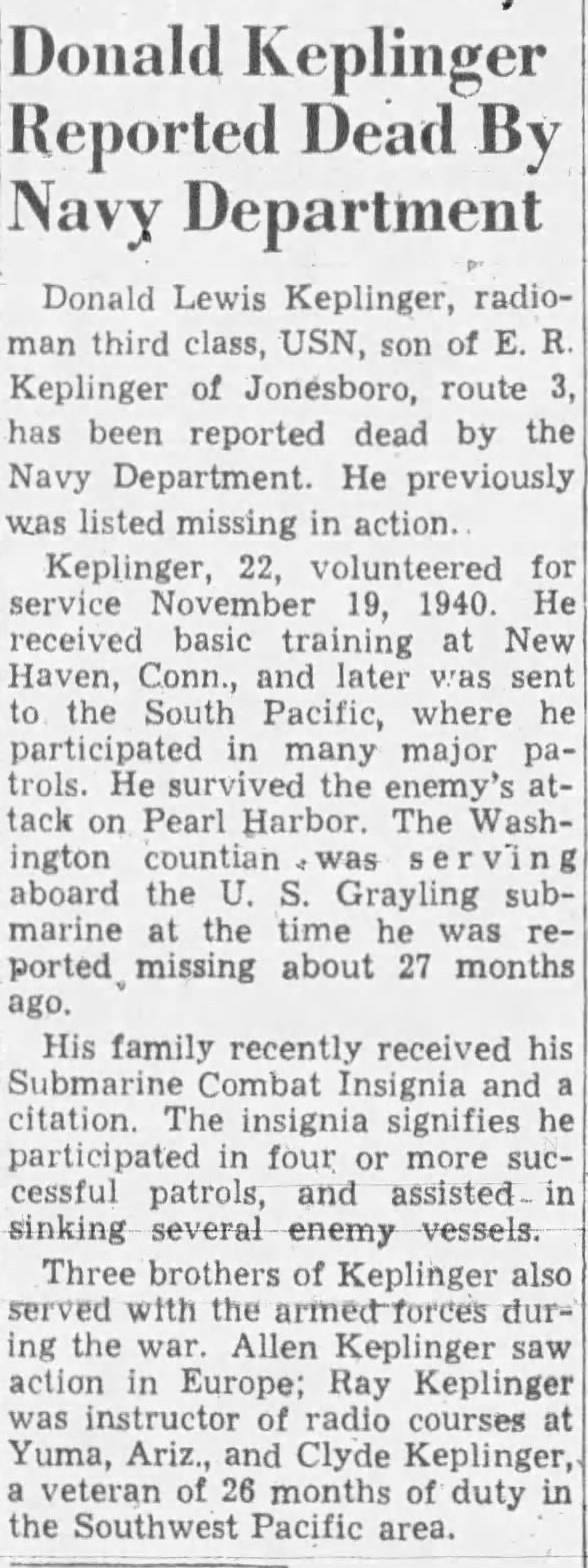 Donald Lewis Keplinger, radioman third class, USN, son of E.R. Keplinger of Jonesboro, route 3, has been reported dead by the Navy Department. He previously was listed missing in action. Keplinger, 22, volunteered for service November 19, 1940. He received basic training at New Haven, Conn., and later was sent to the South Pacific, where he participated in many major patrols. He survived the enemy’s attack on Pearl Harbour. The Washington countian was serving aboard the U.S. Grayling sub-marine at the time he was reported missing about 27 months ago. His family recently received his Submarine Combat Insignia and a citation. The insignia signifies he participated in four or more successful patrols, and assisted in sinking several enemy vessels. Three brothers of Keplinger also served with the armed forces during the war. Allen Keplinger saw action in Europe; Ray Keplinger was instructor of radio courses at Yuma, Ariz., and Clyde Keplinger, a veteran of 26 months of duty in the Southwest Pacific area.