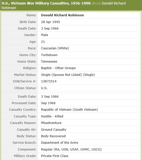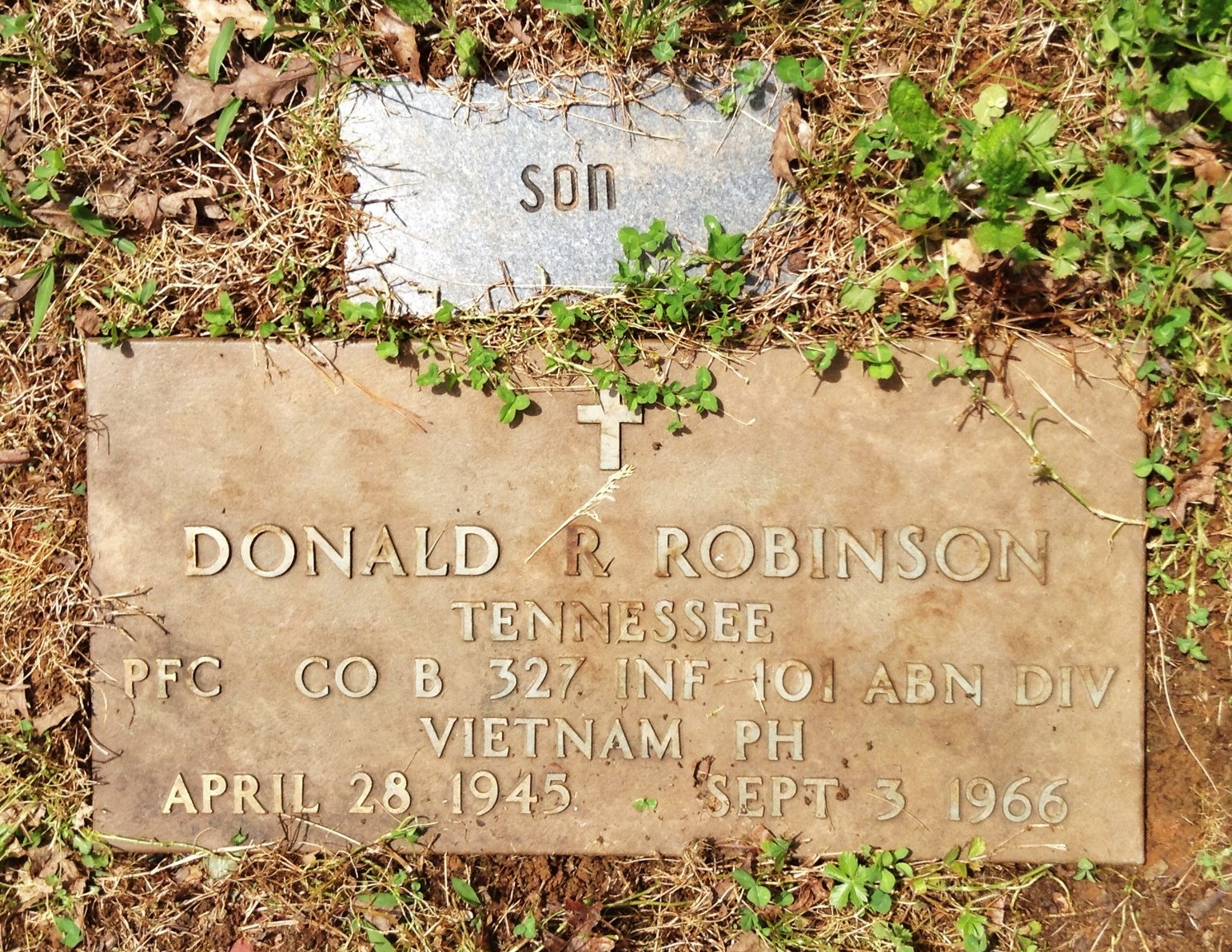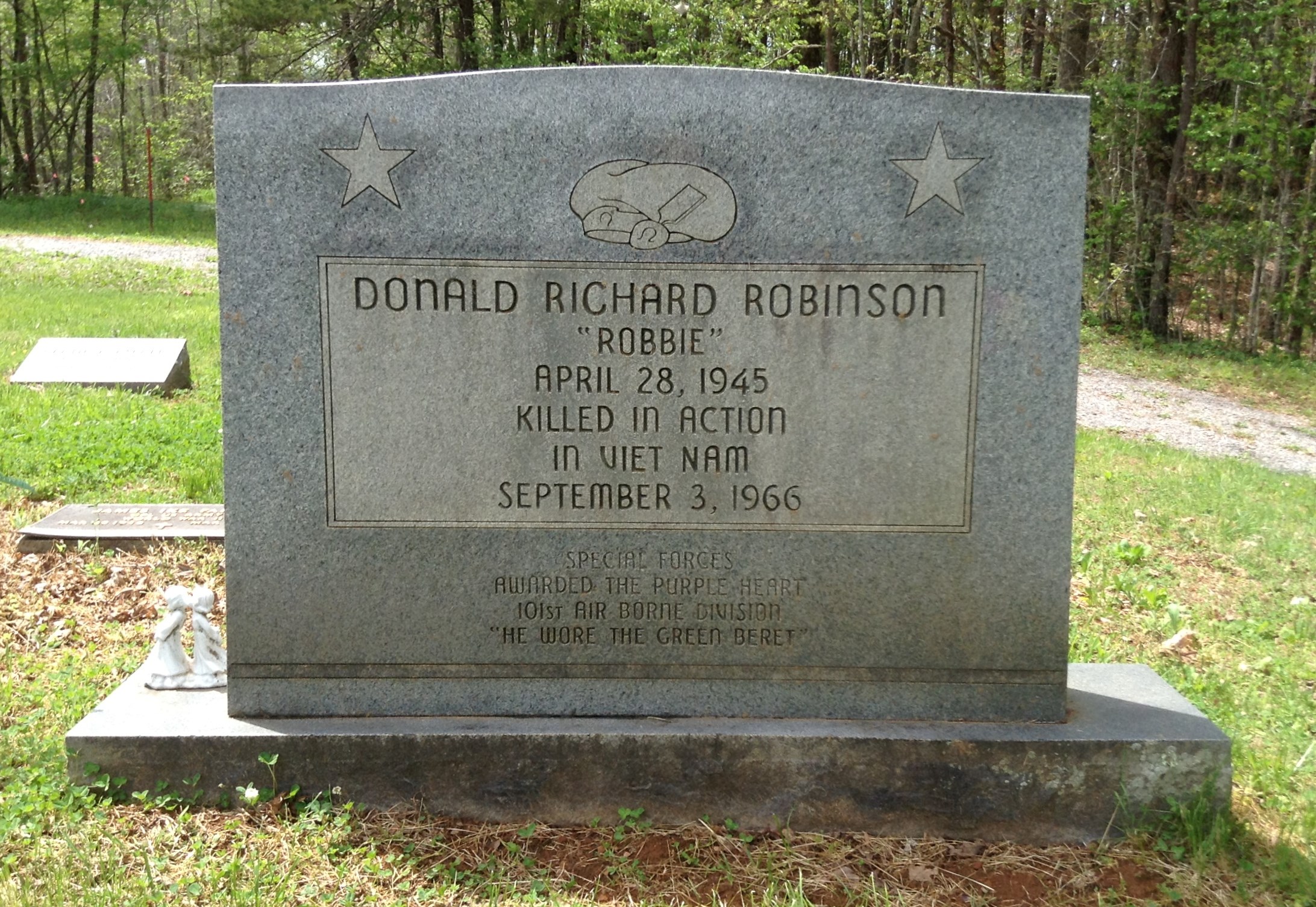 In the memory of Donald Richard Robinson `Robbie´, April 28, 1945, killed in action in Vietnam September 3, 1966. Special Service awarded the Purple Heart.