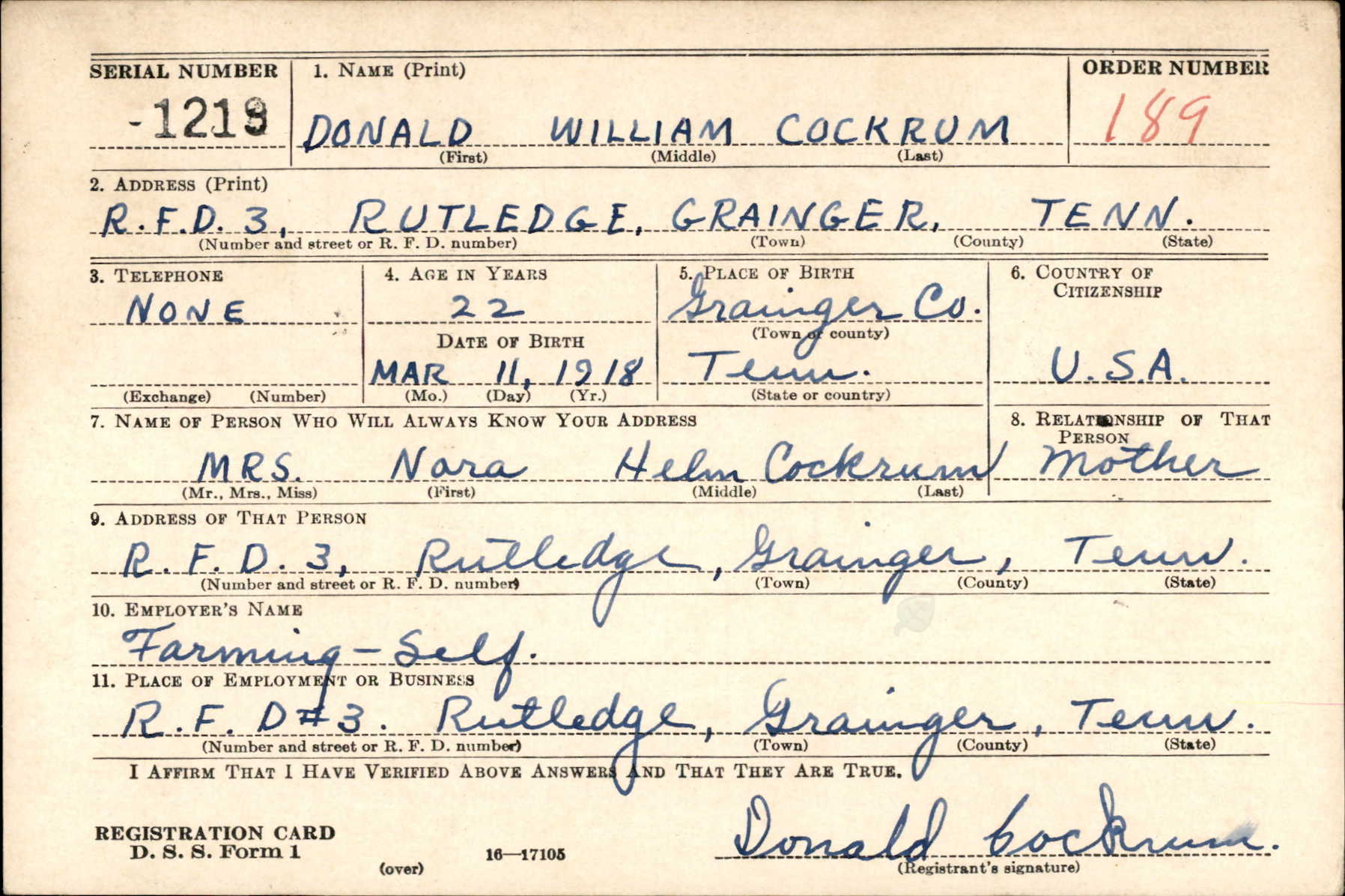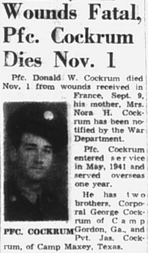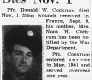 Pfc. Donald W. Cockrum died Nov. 1 from wounds received in France, Sept. 9,his mother, Mrs. Nora H. Cockrum has been notified by the War Department. Pfc. Cockrum entered service in May, 1941 and served overseas one year. He has two brothers, Corporal George Cockrum of Camp Gordon, Ga., and Pvt. Jas. Cockrum of Cam Maxey, Texas.