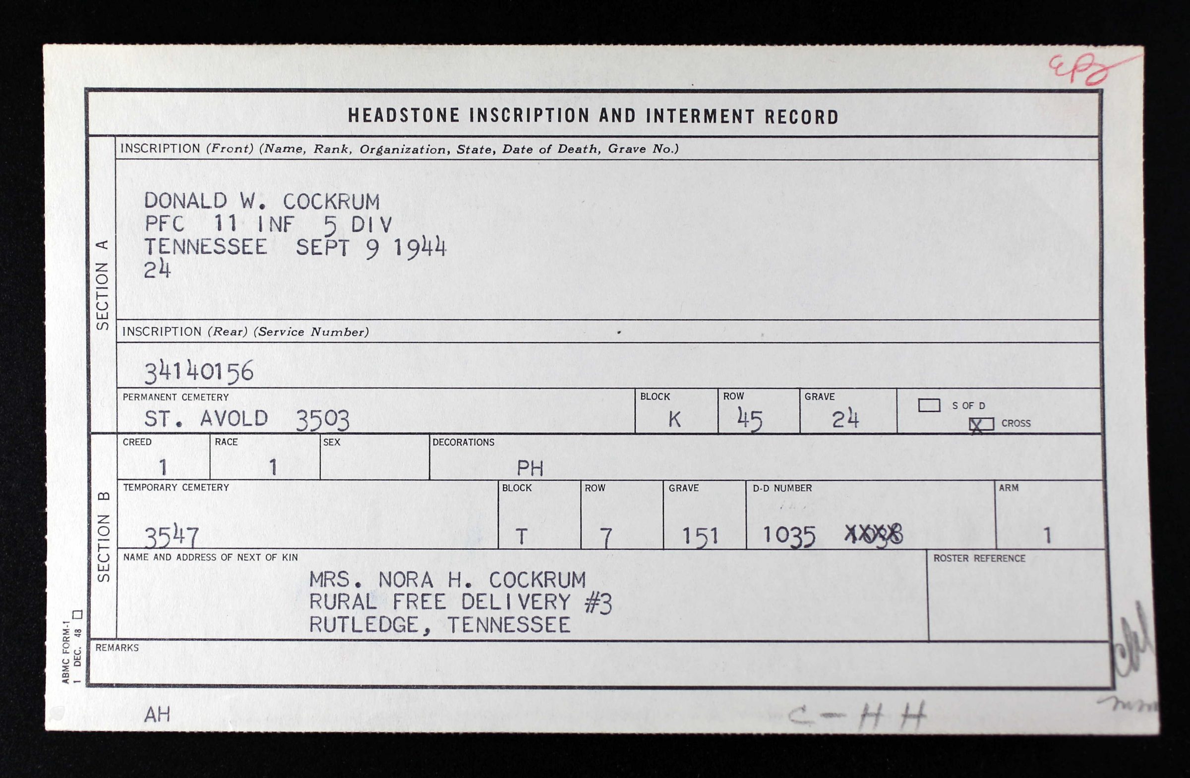 PFC Cockrum died of his wounds on 9 September 1944 and was interred at the Lorraine American Cemetery, St Avold, France, K,45,24.
