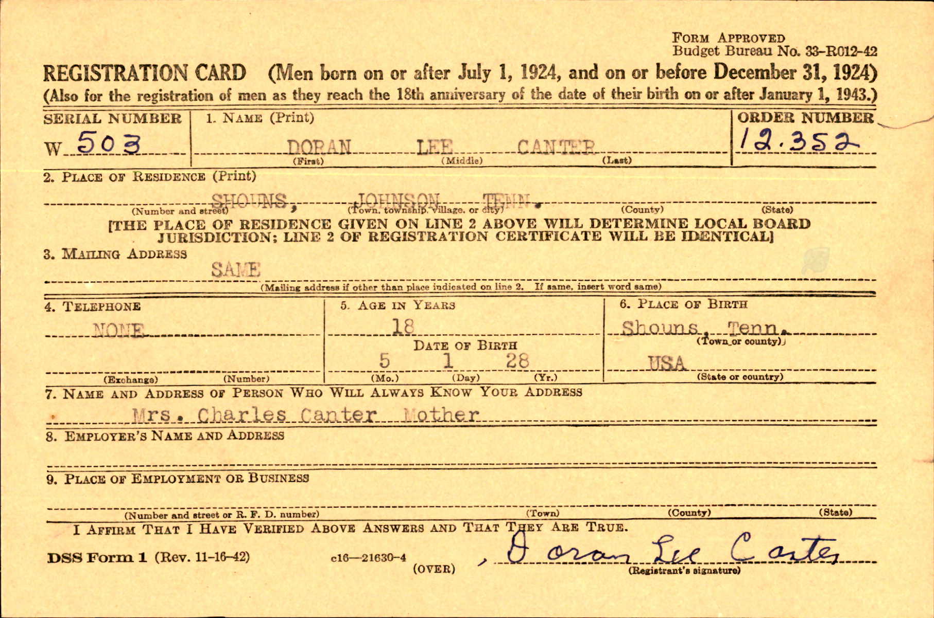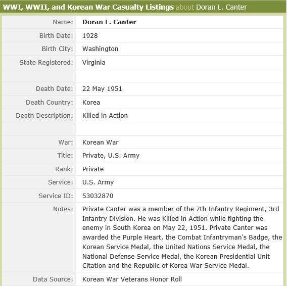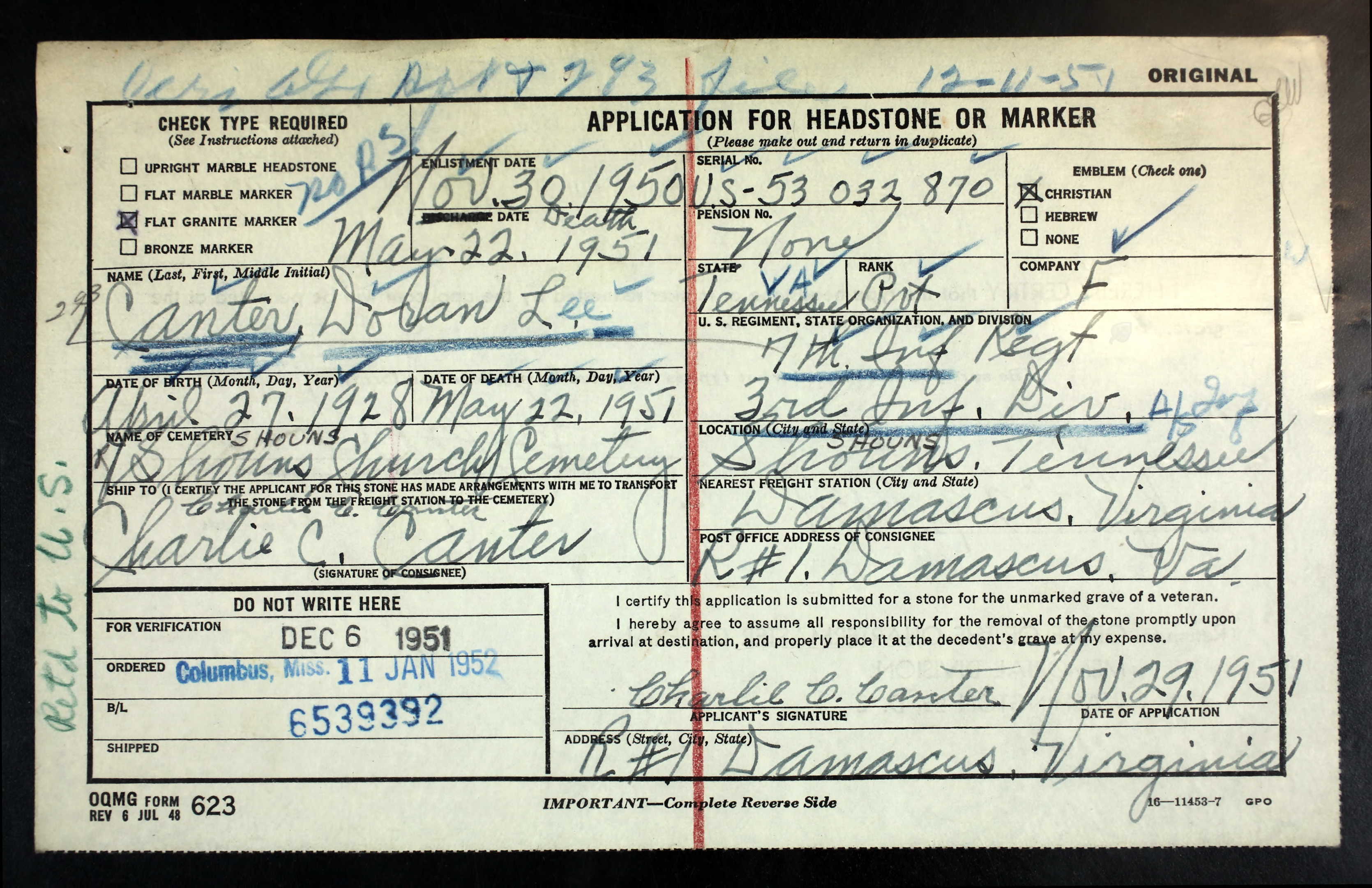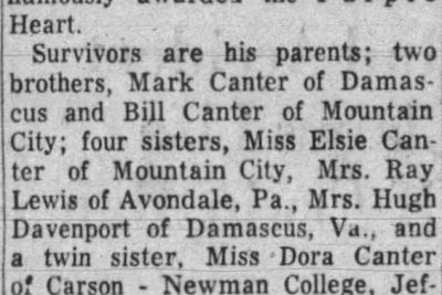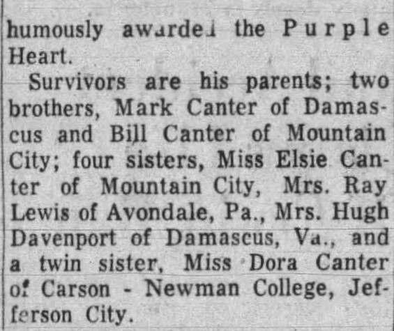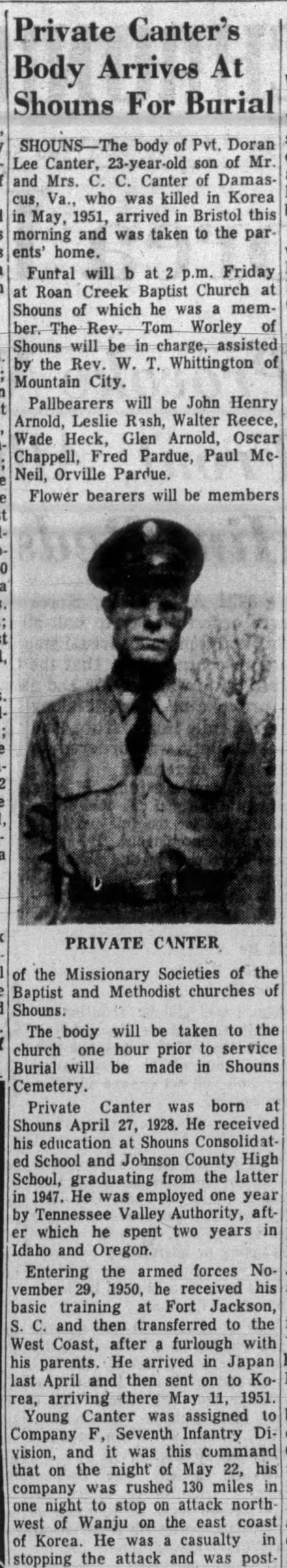 The body of Pvt. Doran Lee Canter, 23-year-old son of Mr. and Mrs. C.C. Canter of Damascus, Va., who was killed in Korea in May, 1951, arrived in Bristol this morning and was taken to the parents’ home. Private Canter was born at Shouns April 27, 1928. He received his education at Shouns Consolidated School and Johnson County High School, graduating from the latter in 1947. He was employed one year by Tennessee Valley Authority, after which he spent two years in Idaho and Oregon. Entering the armed forces November 29, 1950, he received his basic training at Fort Jackson, S.C., and then transferred to the West Coast, after a furlough with his parents. He arrived in Japan last April and then sent on to Korea, arriving there May 11, 1951. Young Canter was assigned to Company F, Seventh Infantry Division, and it was this command that on the night of May 22, his company was rushed 130 miles in one night to stop on attack northwest of Wanju on the coast of Korea. He was a casualty in stopping the attack and was posthumously awarded the Purple Heart. Survivors are his parents; two brothers, Mark Canter of Damascus and Bill Canter of Mountain City; four sisters, Miss Elsie Canter of Mountain City, Mrs. Ray Lewis of Avondale, Pa., Mrs. Hugh Davenport of Damascus, Va., and a twin sister, Miss Dora Canter of Carson – Newman College, Jefferson City.