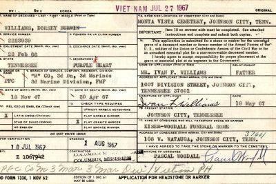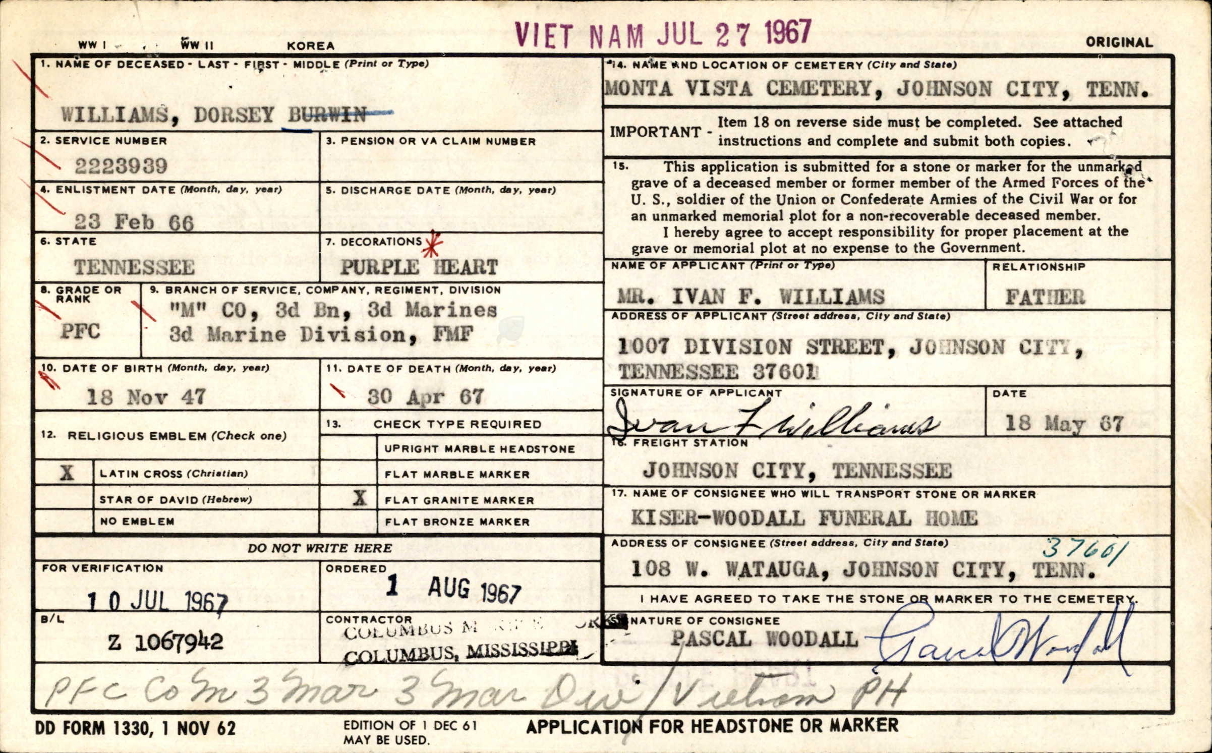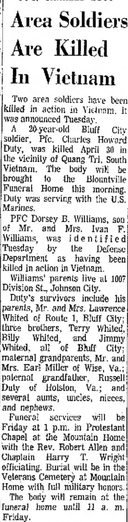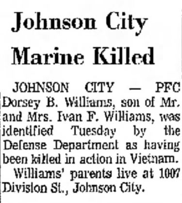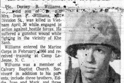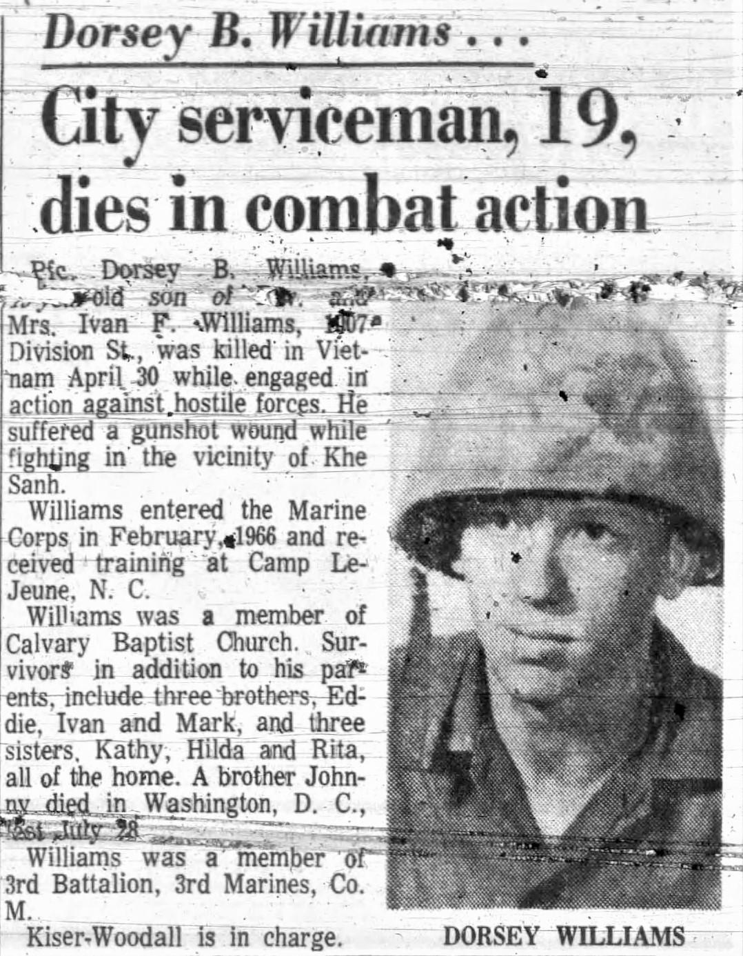 Pfc. Dorsey B. Williams, son of Mr. and Mrs. Ivan F. William, 1007 Division street, was killed in Vietnam April 30 while engaged in action against hostile forces. He suffered a gunshot wound while fighting in the vicinity of Khe Sanh. Williams entered the Marine Corps in February 1966 and received training at Camp LeJeune, N.C. Williams was a member of Calvary Baptist Church. Survivors in addition to his parents, include three brothers, Eddie, Ivan and Mark, and three sisters, Kathy, Hilda and Rita, all of the home. A brother Johnny died in Washington, D.C. last July 28.