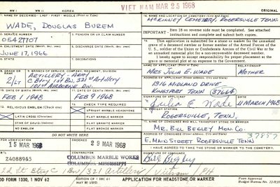 His mother, Mrs. Julia Burem Wade of 1316 Midland Drive, was notified Feb. 14 that he had been missing since his unit, Battery A, 321 Artillery, 101st Airborne Division, engaged a hostile force in a firefight during a combat operation Feb. 9. He had been in Vietnam since December, and had been in service since graduating from Dobyns-Bennett High School in June, 1965. After receiving basic training at Ft. Benning, Ga., he was assigned to Electronics School at Frt. Monmouth, N.J.