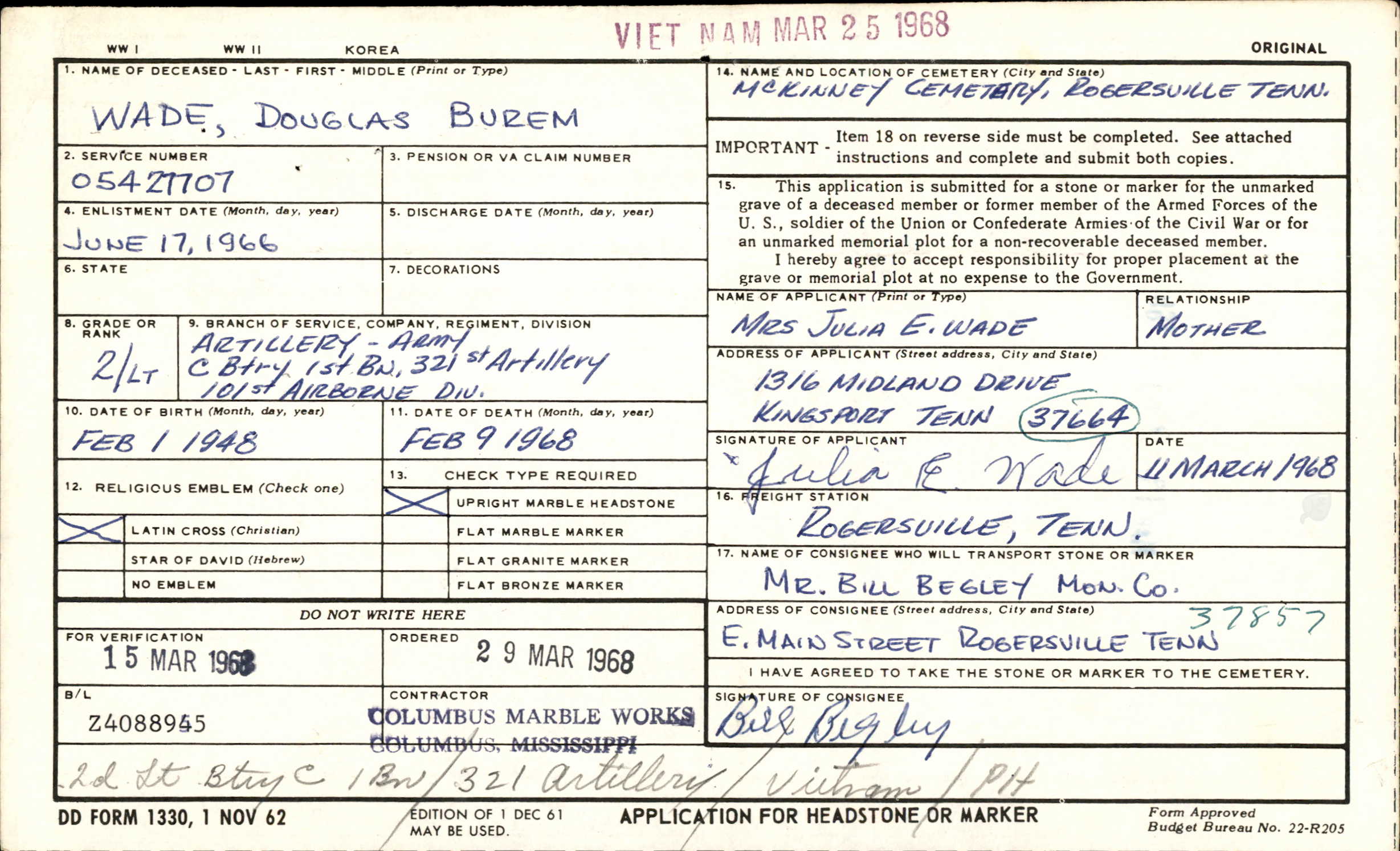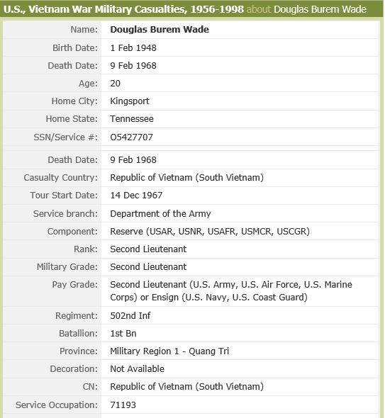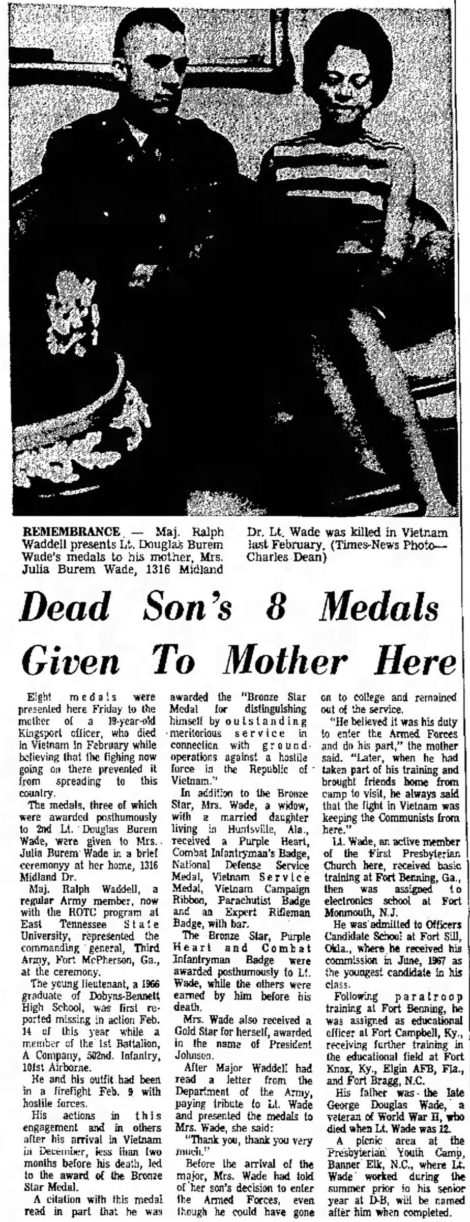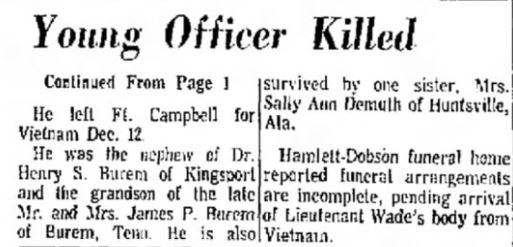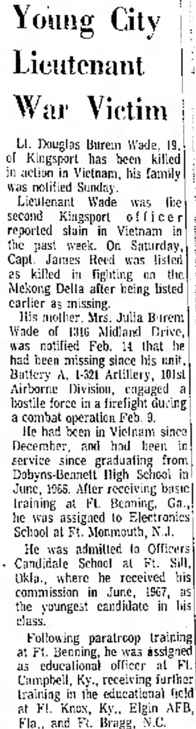Young City Lieutenant War Victim. Lt Douglas Burem Wade, 19, of Kingsport, has been killed in action in Vietnam, his family was notified Sunday.