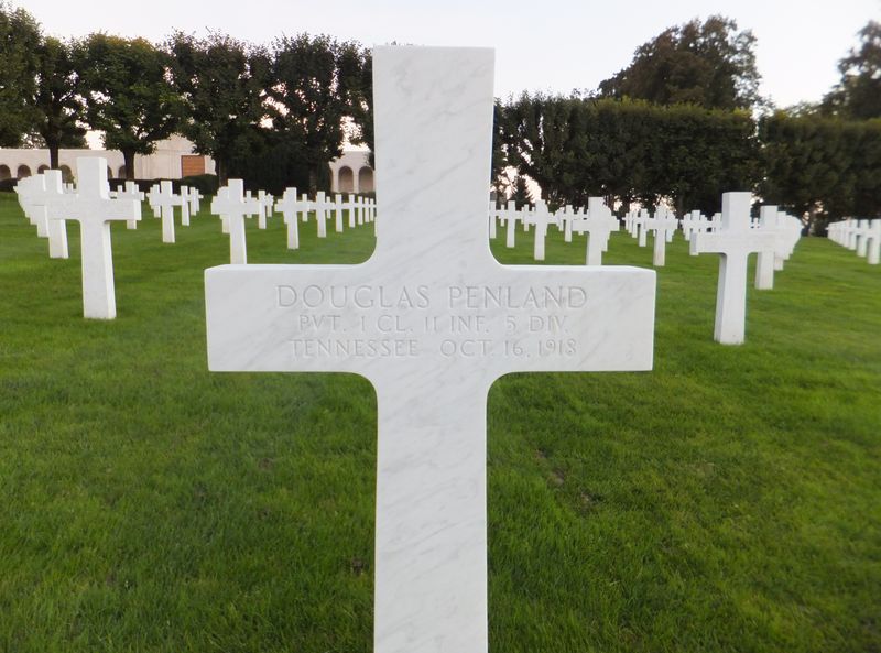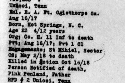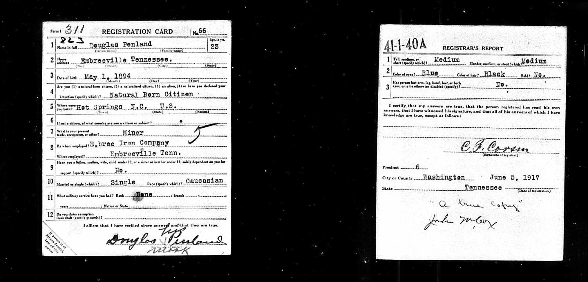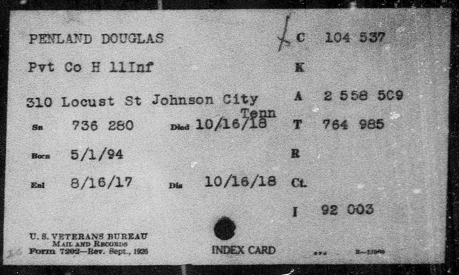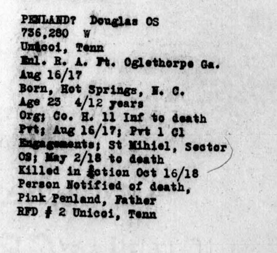 Private First Class Douglas Penland was born on May 1, 1894 in Hot Springs, North Carolina. He was the son of Pink and Nannie Penland. He had two sisters, Marie Penland and Blanche Penland. Private First Class Penland grew up in Hot Springs, but moved to Unicoi County sometime between 1910 and 1917. He lived in Embreeville, Tennessee where he worked as a miner for Embree Iron Company. He enlisted in the military on August 16, 1917. He was sent overseas on May 2, 1918 and served in the 11th Infantry Regiment, 5th Division. He was killed in action on October 16, 1918 and is buried in Meuse-Argonne American Cemetery in Romagne, France (Plot G,31,10).