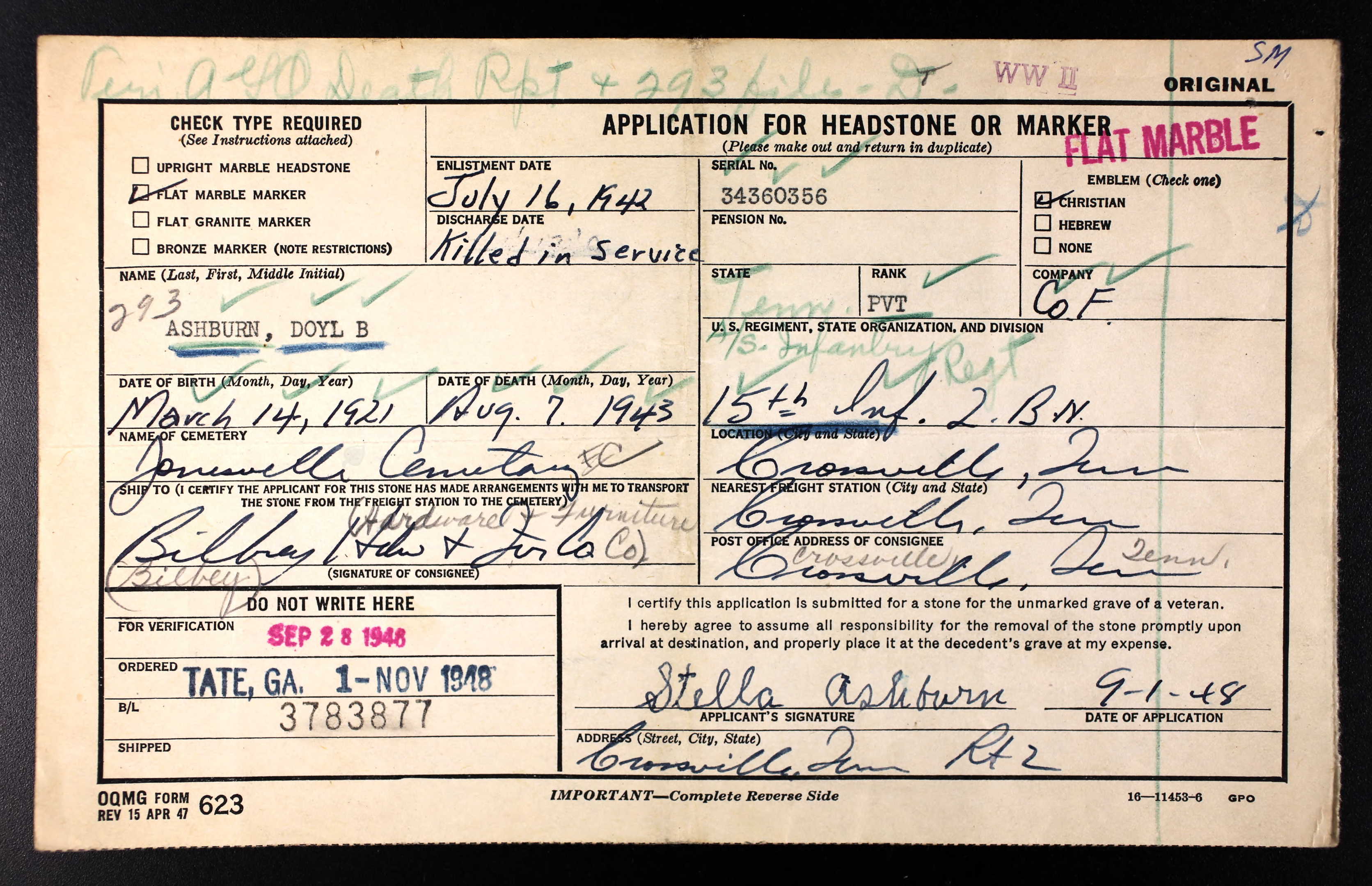 Last rites for Pvt. Doyle B. Ashburn, who gave his life for his country in the North Africa area in August, 1943, were held at the Bilbrey Funeral Home. Militaryservices were held at the Jonesville Cemetery in Fentress County.