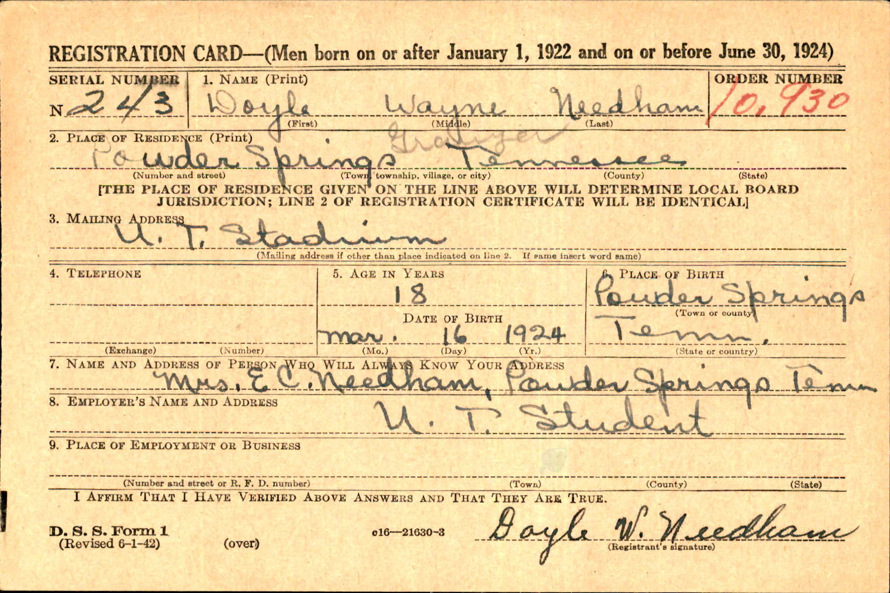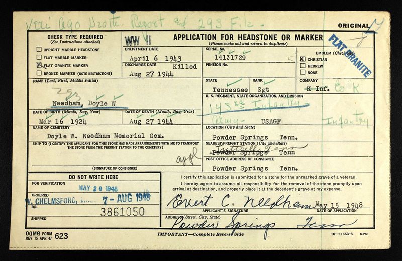 Doyle Wayne Needham was born at Powder Springs, Tennessee on 16 March 1924, the son of Everett Cecil Needham and Lettie Lay.
