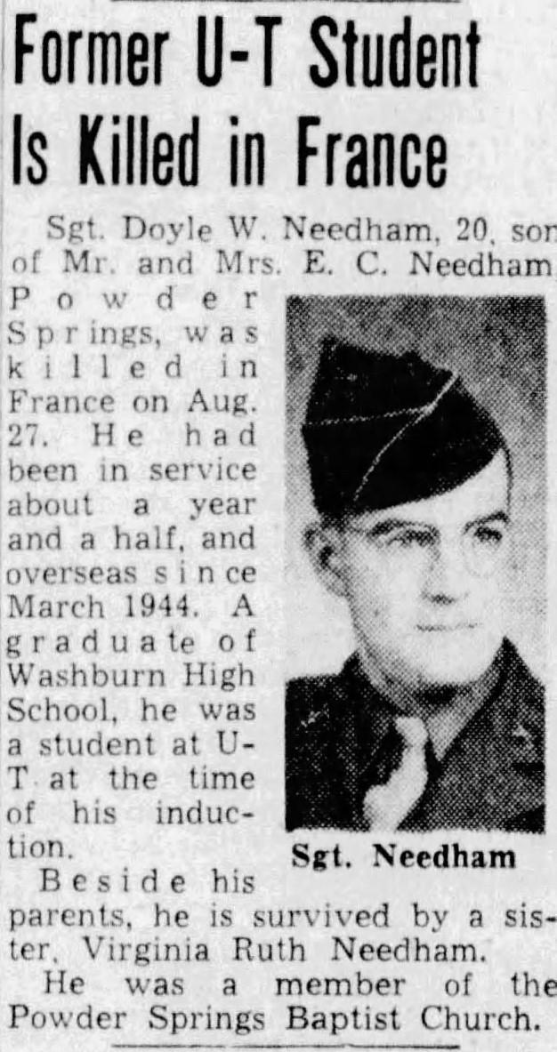 Sgt. Doyle W. Needham, 20, son of Mr. and Mrs. E.C. Needham, Powder Springs, was killed in France on Aug. 27. He had been in service about a year and a half, and overseas since March 1944. A graduate of Washburn High School, he was a student at U-T at the time of his induction. Beside his parents, he is survived by a sister, Virginia Ruth Needham. He was a member of the Powder Springs Baptist Church.