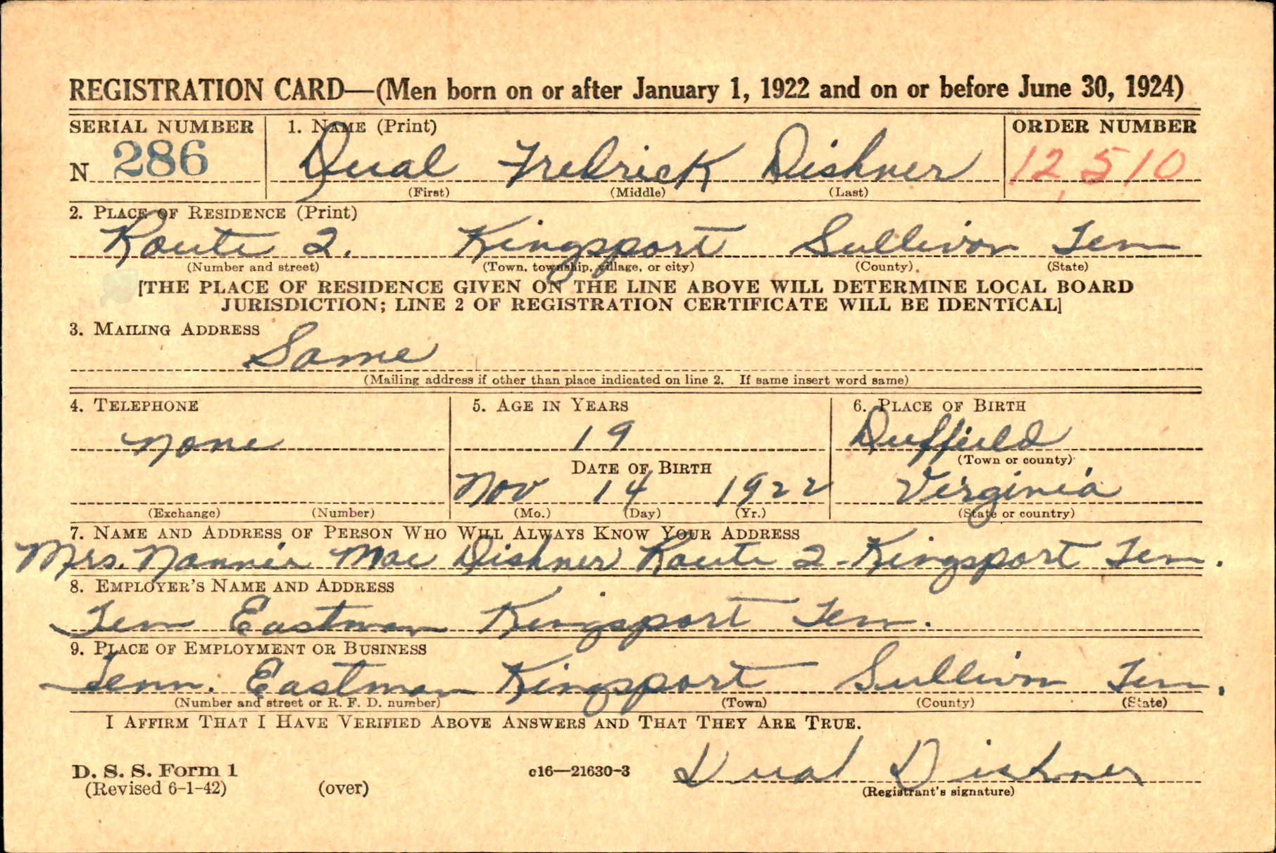Dual Fredrick Dishner was born on 14 November 1922 in Duffield, Virginia. Son of Martin Wilburn Dishner and Nannie Mae Dinsmore.