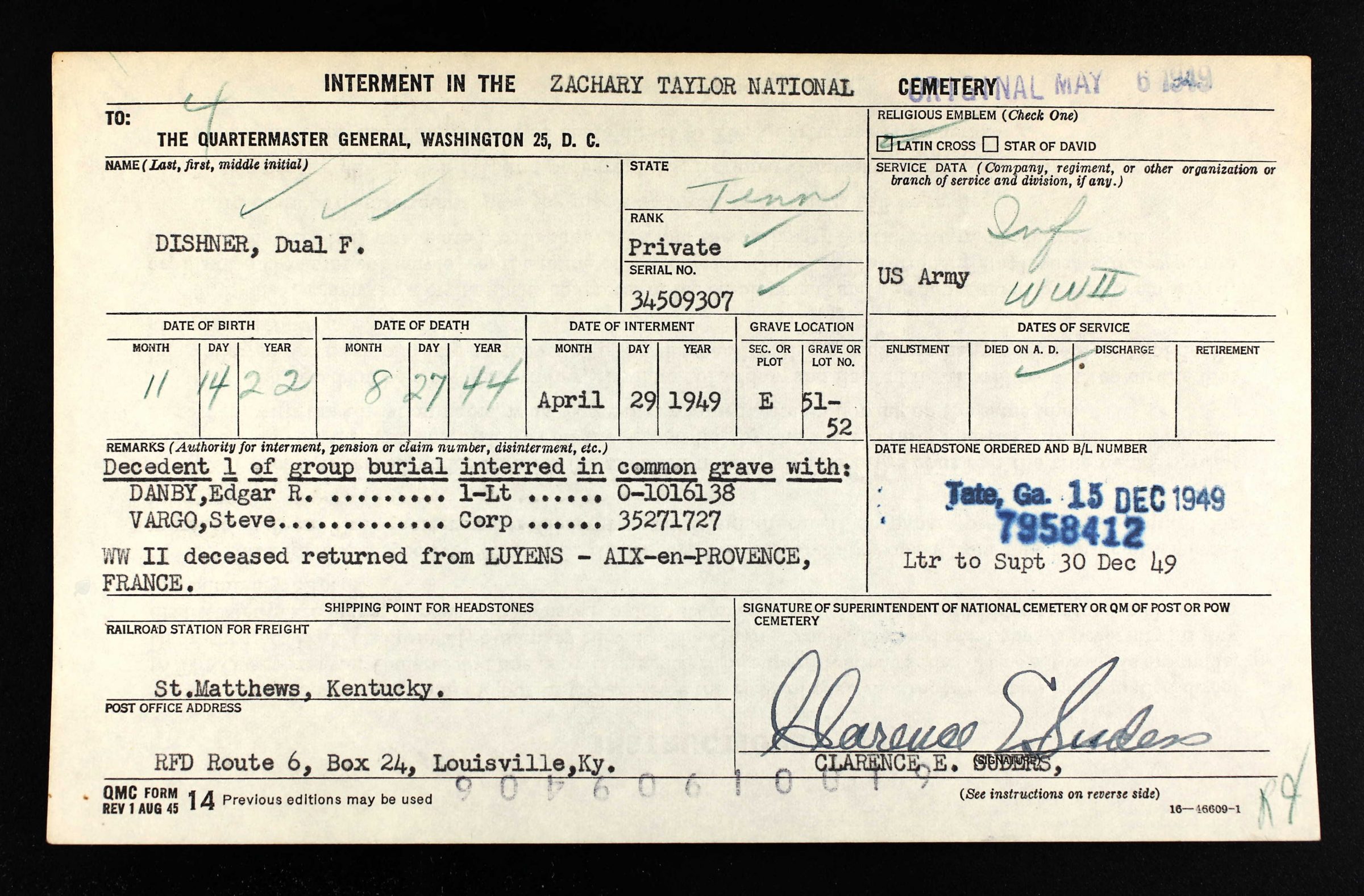 Private Dishner was killed in action while serving with the Third Infantry Division in the Battle of Northern France.