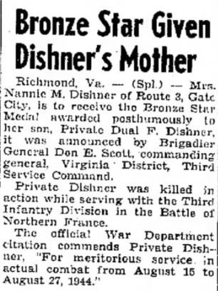 Richmond, Va. Mrs. Nannie M. Dishner of Route 3, Gate City, is to receive the Bronze Star Medal awarded posthumously to her son, Private Dual F. Dishner, it was announced by Brigadier General Don E. Scott, commanding general, Virginia District, Third Service Command.