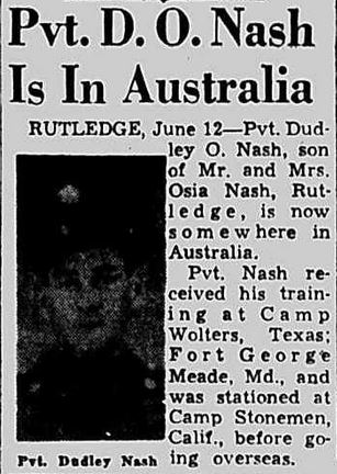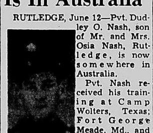 Rutledge, June – Pvt. Dudley O. Nash, son of Mr. and Mrs. Osia Nash, Rutledge, is now somewhere in Australia. Pvt. Nas received his traning at Camp Wolters, Texas; Fort George Meade, Maryland and was stationed at Camp Stonemen, Calif., before going overseas.