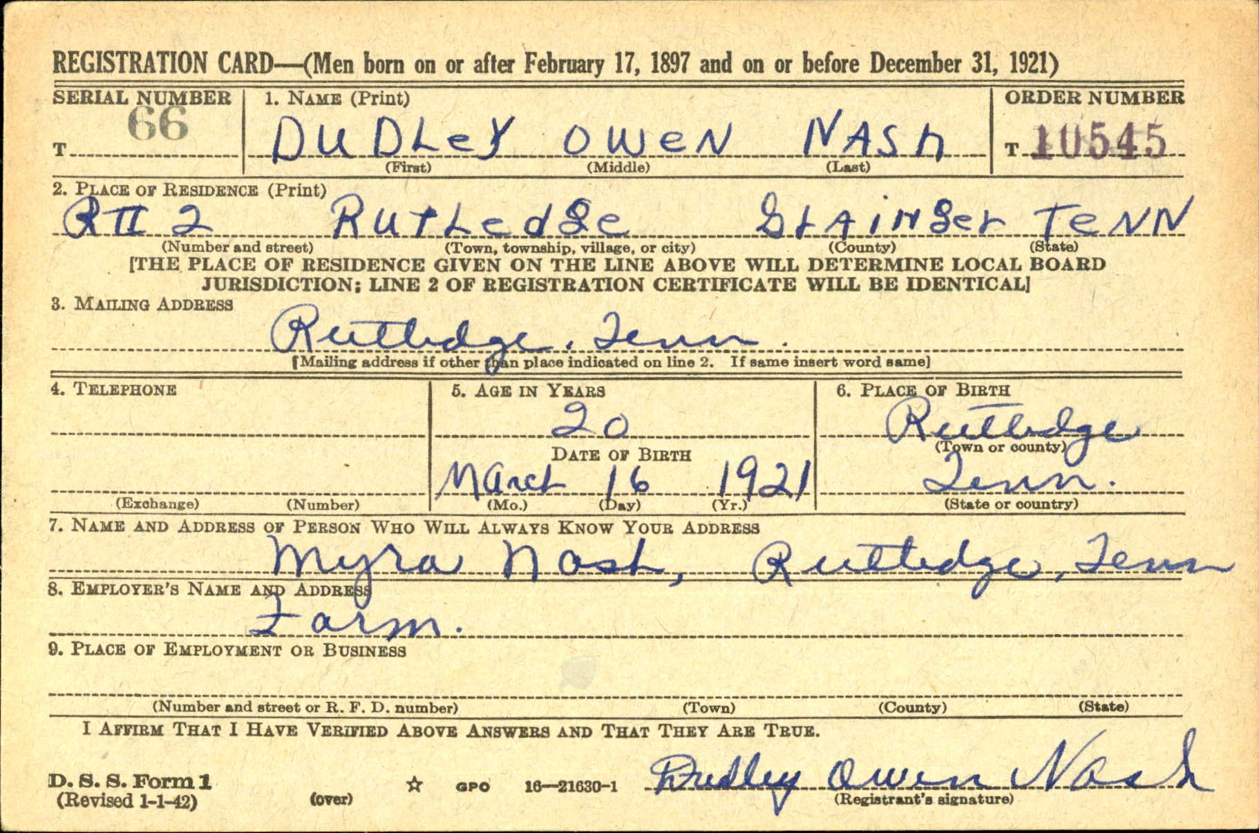 Dudley Owen Nash was born 16 March 1921 at Rutledge, Tennessee, to Osia Kendrick Nash and Myra Daisey Hixon