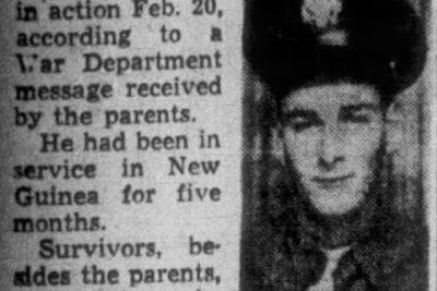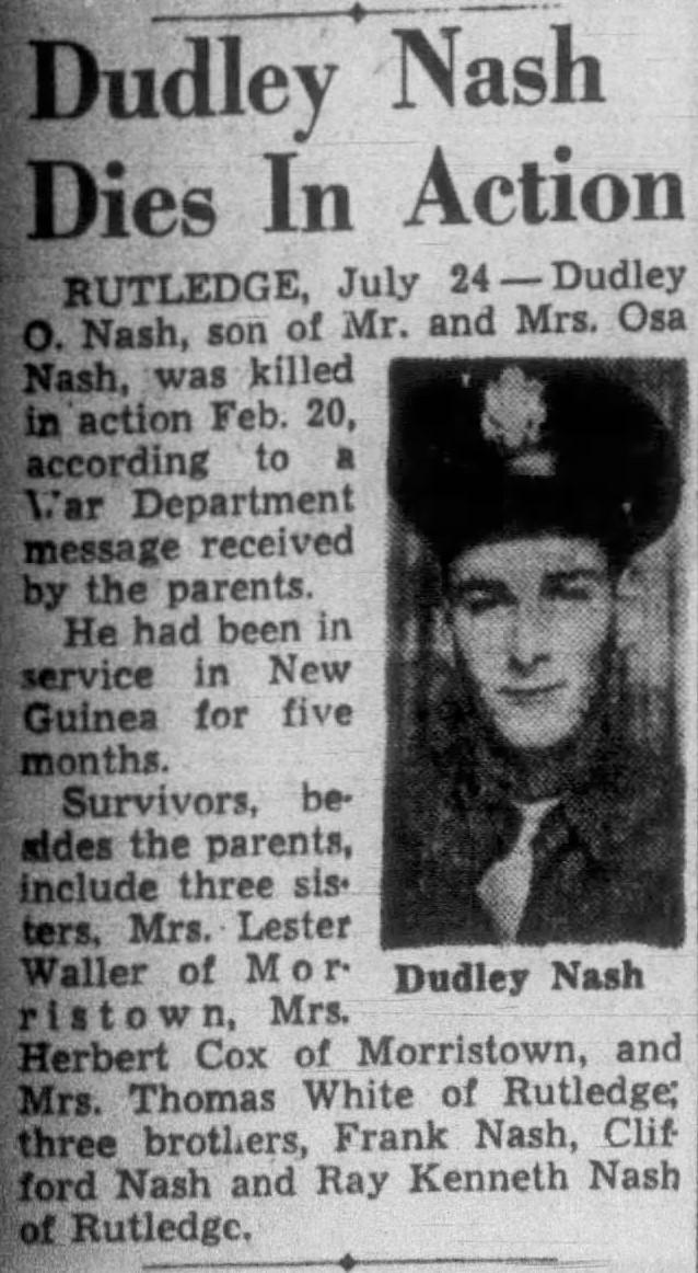 Dudley O. Nash, son of Mr. and Mrs. Osa Nash, was killed in action Feb. 20, according to a War Department message received by his parents. He had been in service in New Guinea for five months. Survivors, besides the parents, include three sisters, Mrs. Lester Waller of Morristown, Mrs. Herbert Cox of Morristown, and Mrs. Thomas White of Rutledge; three brothers, Frank Nash, Clifford Nash and Ray Kenneth Nash of Rutledge.