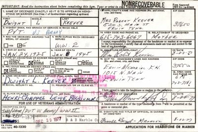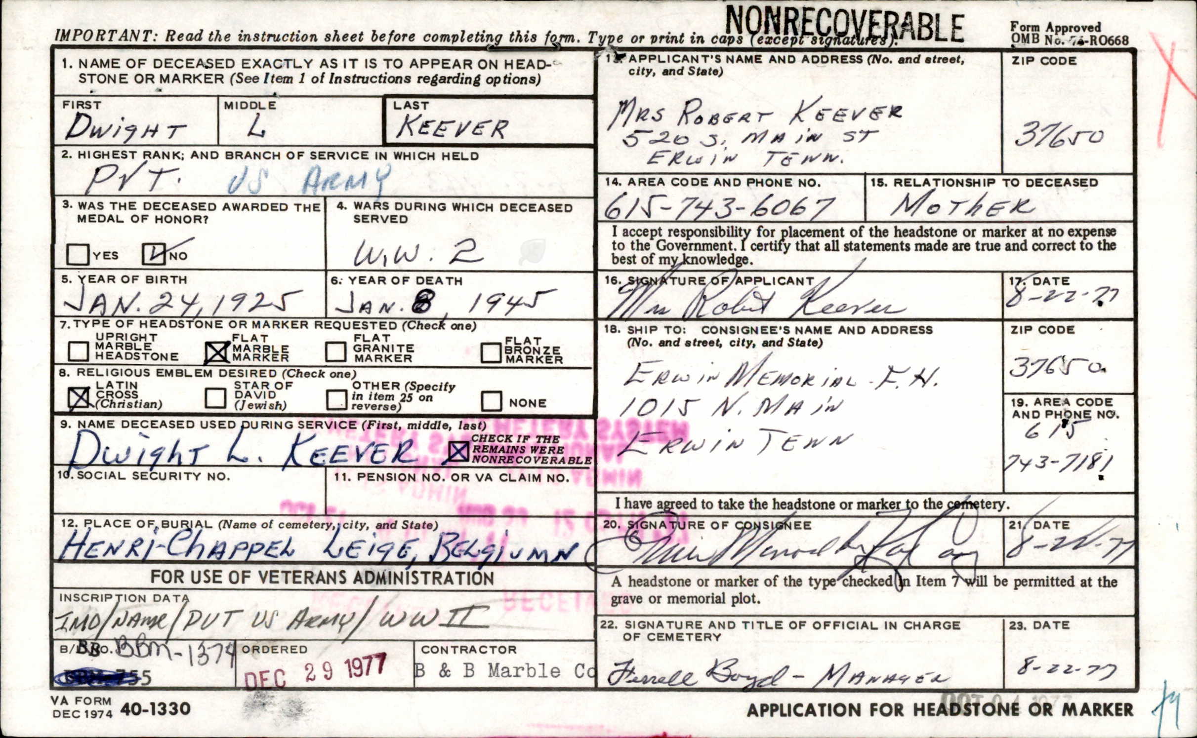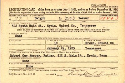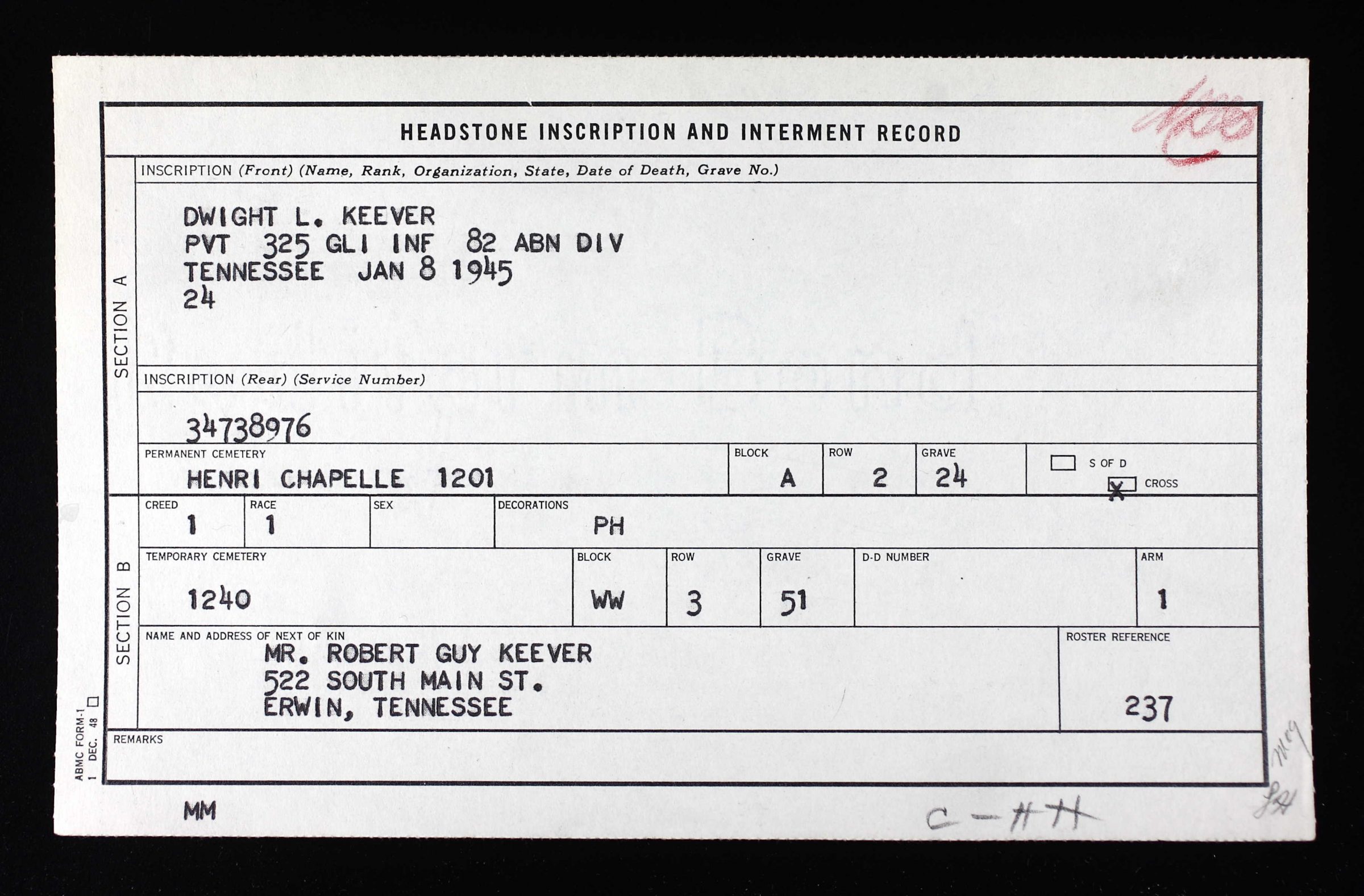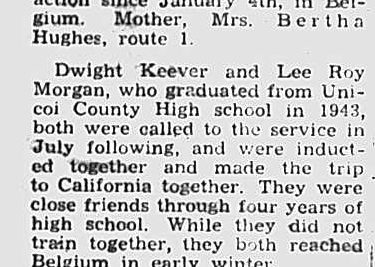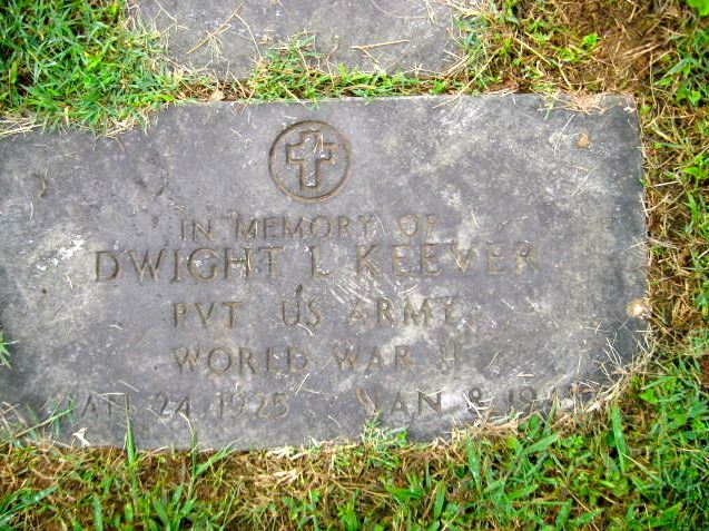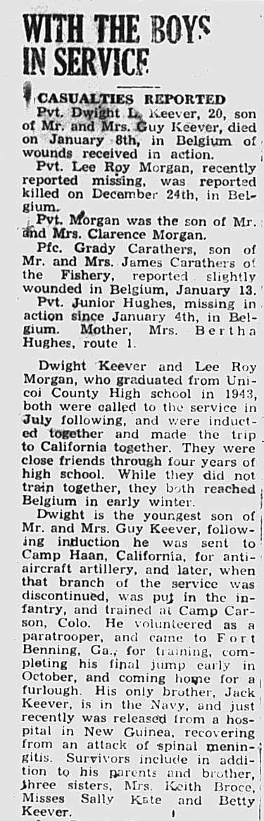 Pvt. Dwight L. Keever, 20, son of Mr. and Mrs. Guy Keever, died on January 8, in Belgium of wounds received in action. Dwight Keever graduated from Unicoi County High school in 1943 and was called to the service in July following and was sent to Camp Haan in California, for anti-aircraft artillery and later, when that branch of the service was discontinued, was put in the infantry and trained at Camp Carson, Colorado. He volunteered as a paratrooper, and came to Fort Benning, Ga., for training, completing his final jump early in October, and coming home for a furlough. His only brother Jack Keever, is in the Navy, and just recently was released from a hospital in New Guinea, recovering from an attack of spinal meningitis. Survivors include in addition to his parents and brother, three sisters, Mrs. Keith Broce, Misses Sally Kate and Betty Keever.