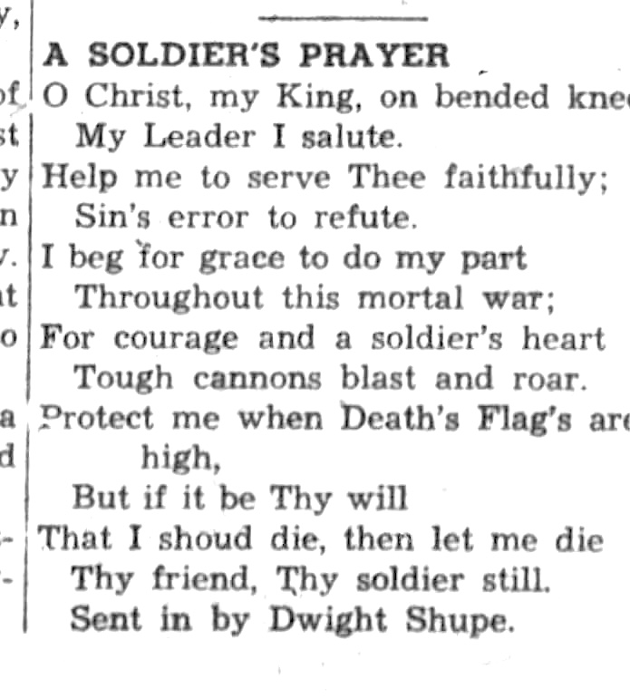 Dwight Shupe, son of Mr. and Mrs. C.O. Shupe of Mountain City is reported as missing in action. Sgt Shupe has been for some time fighting on the French battlefronts.