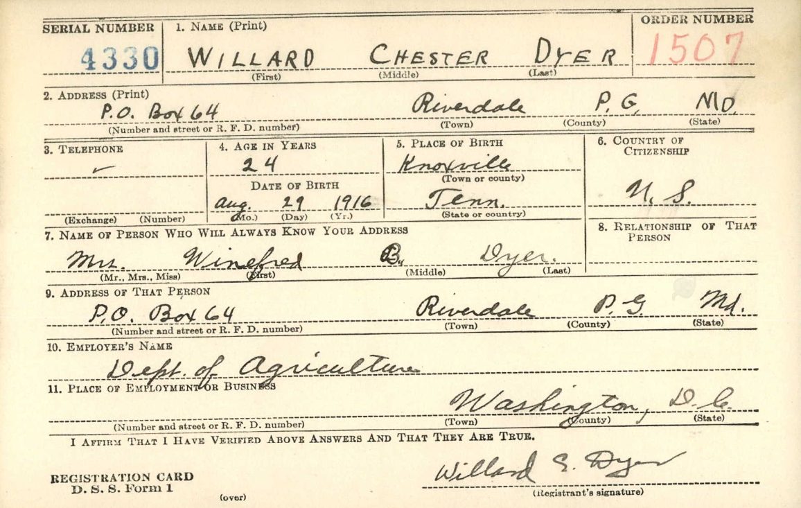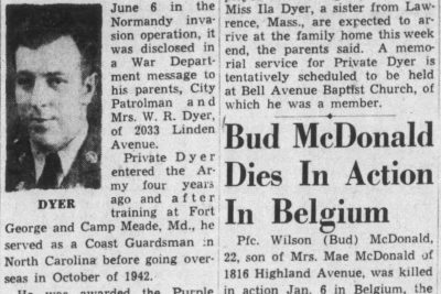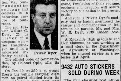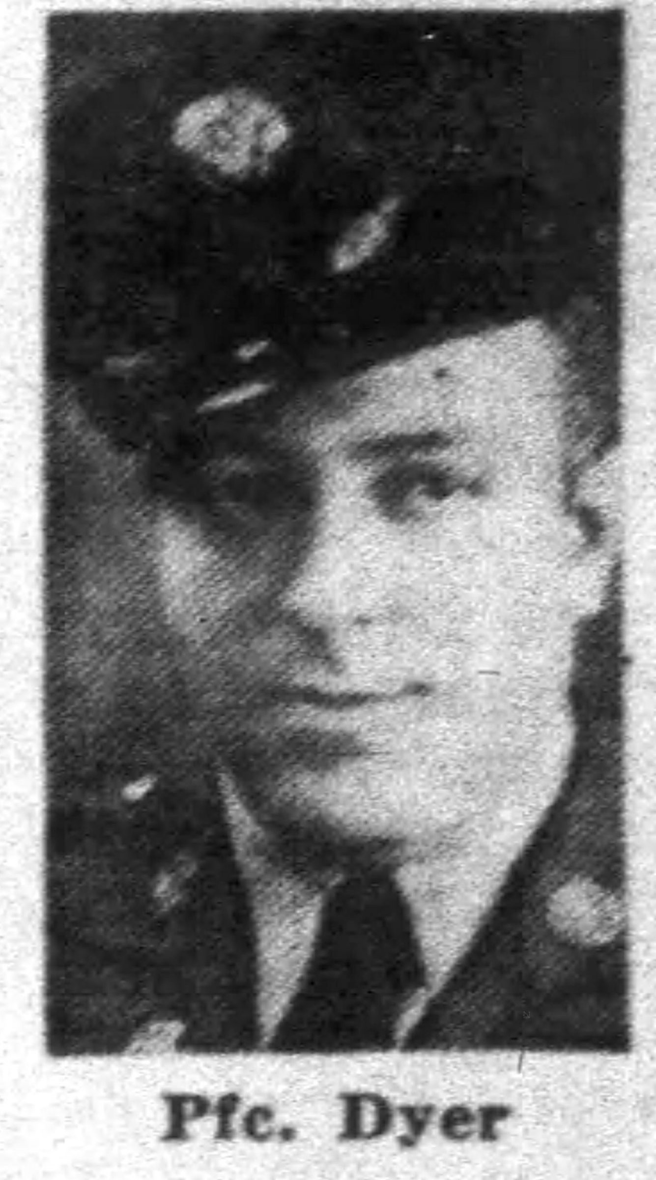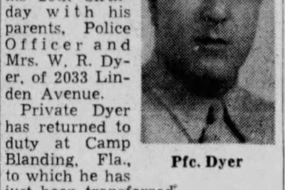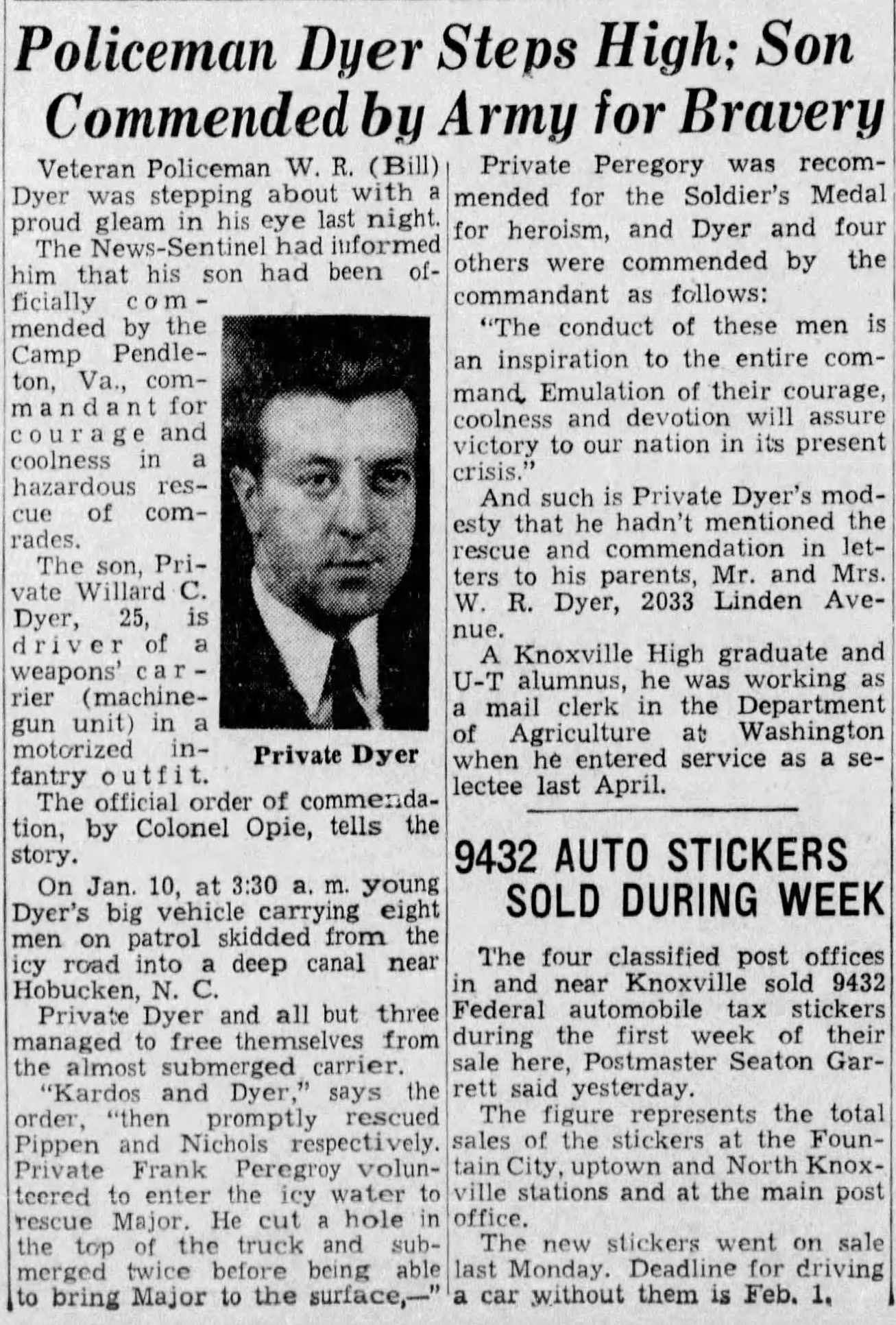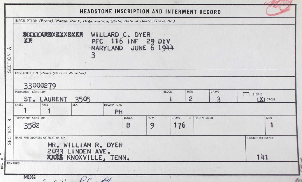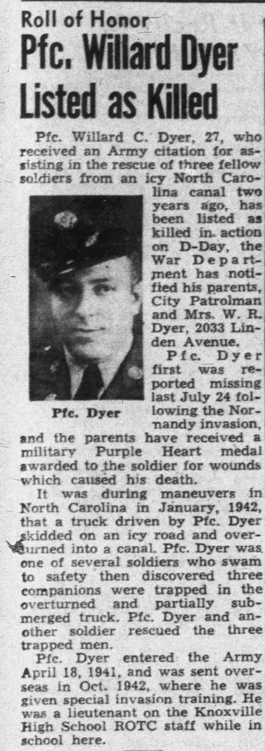 PFC Willard Chester Dyer was born 9 Aug 1916 in Knoxville, Tennessee to William Richard and Eliza M (Arms) Dyer. William was a city policeman whose 1939 income (after at least 20 years service) was $1800. In 1940 Willard was clerking in a store. The family lived at 2033 Linden Avenue.